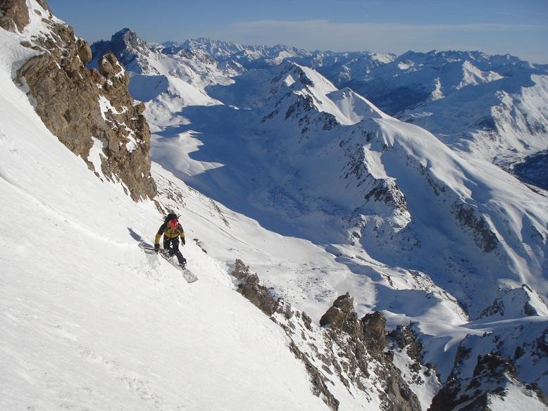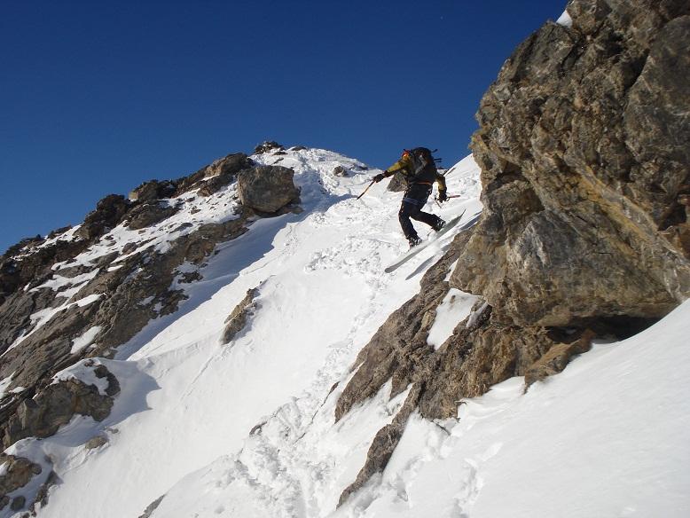 Si e siamo in piena parete. Ottima farina assestata su fondo duro. Siamo in vetta. Uno sguardo verso il cielo, ora azzurro intenso ci fa pensare a Pierre Lombard autore della prima discesa…