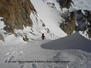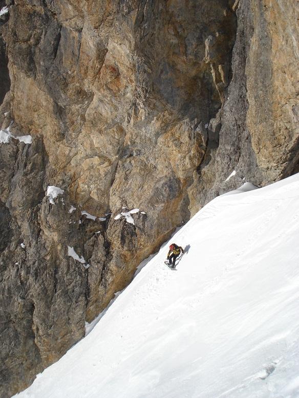 Saliamo il canale. Neve beton, uguale a quella di ieri. Masso incastrato..cengia, sarà lei…