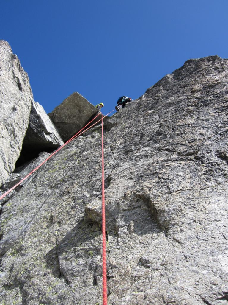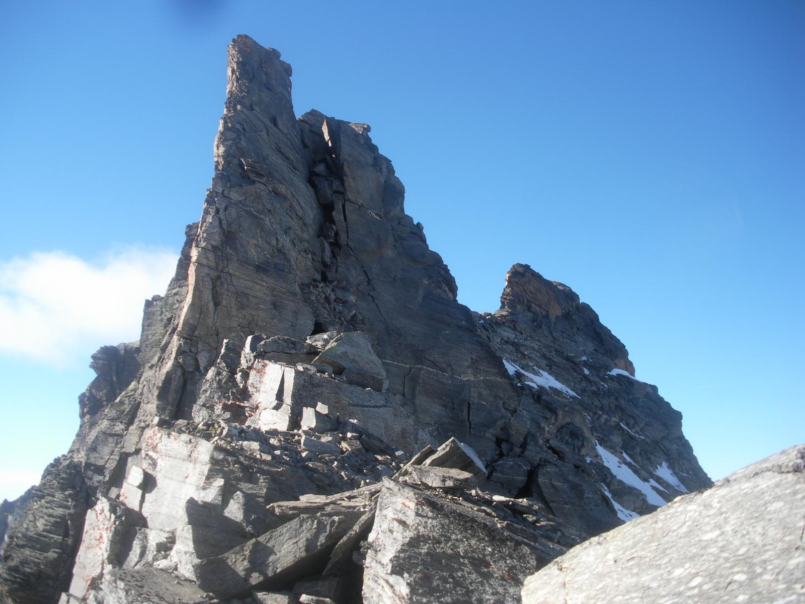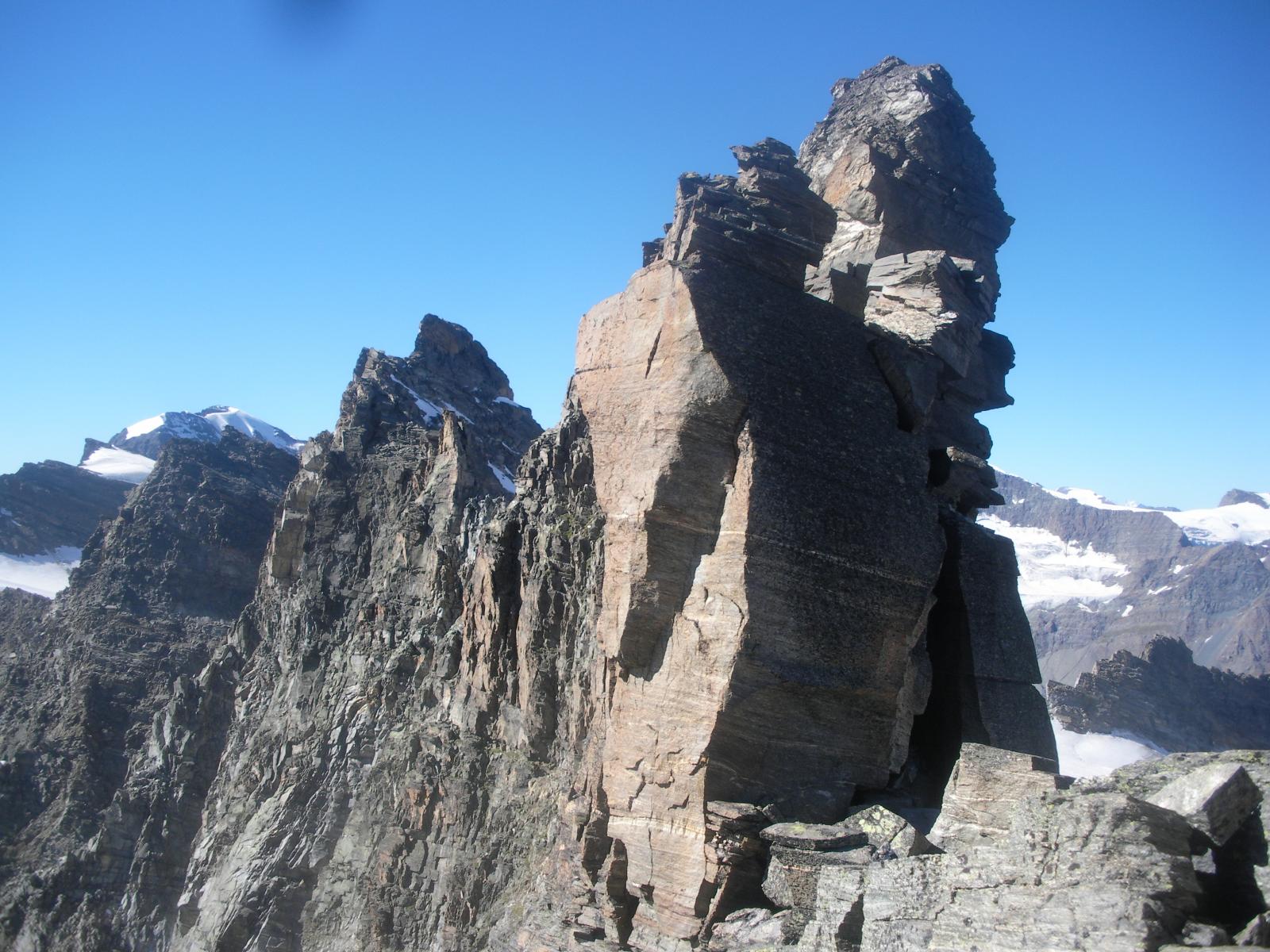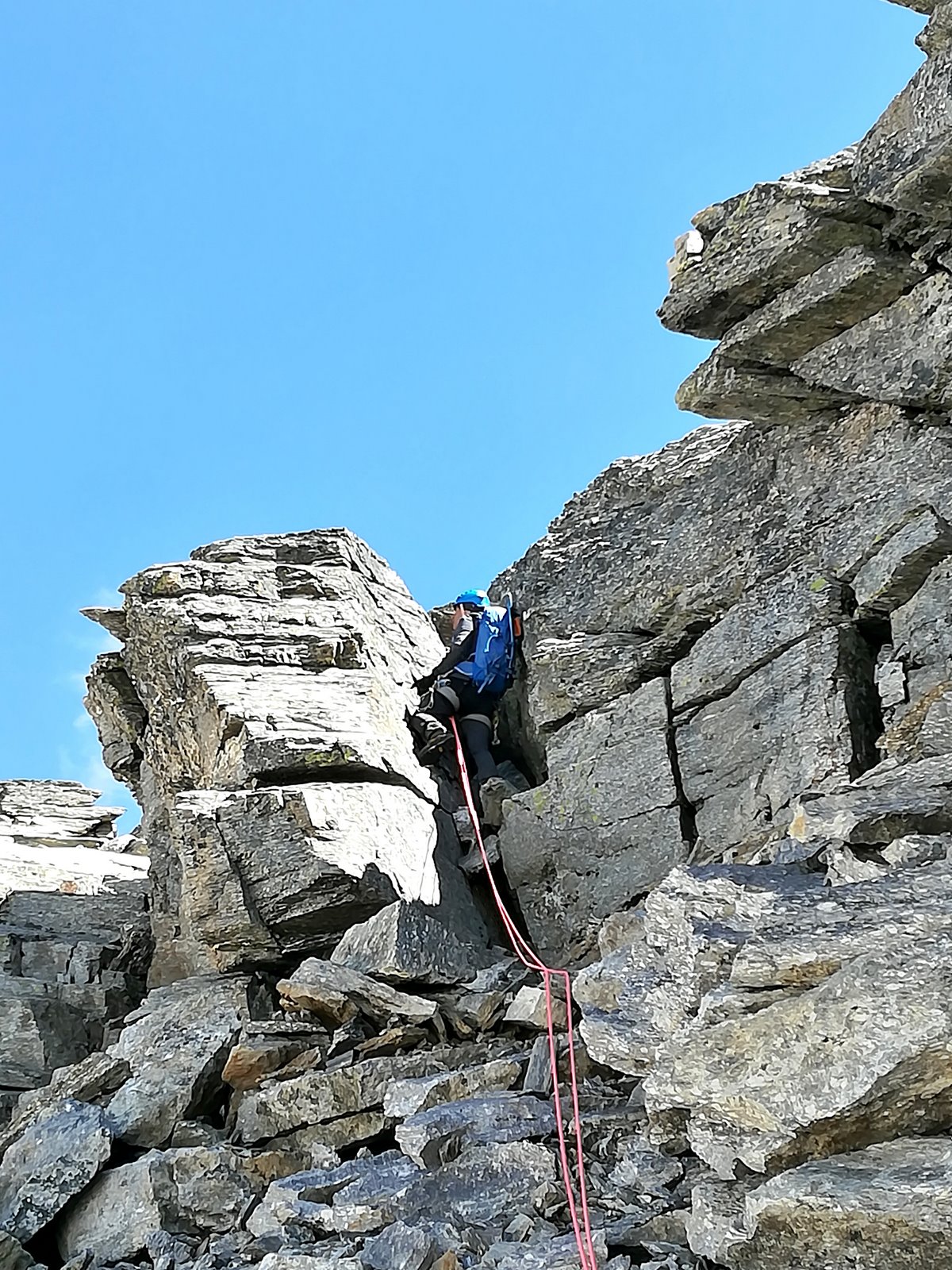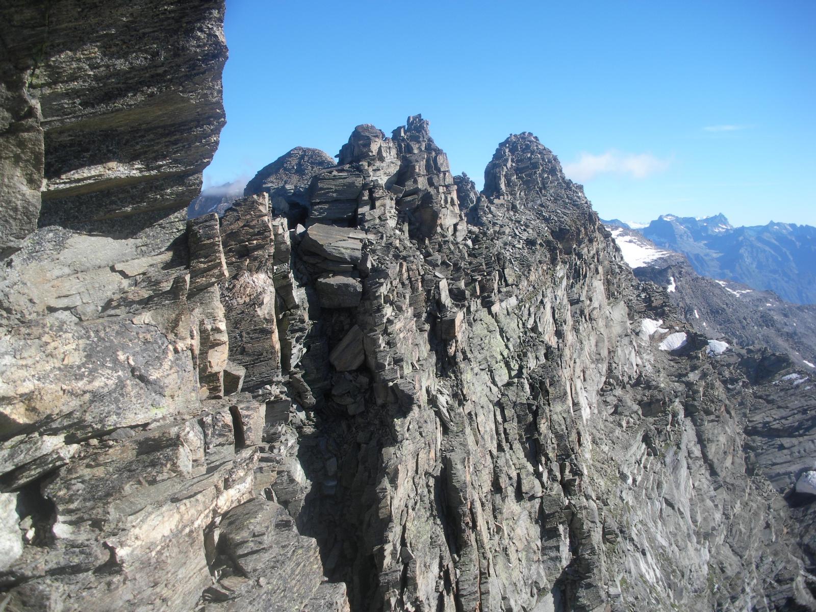 Continuare verso nord sulla cresta scavalcando con divertente arrampicata (max diff. III) i vari torrioncini che si susseguono, le cui difficoltà si possono anche evitare in parte tenendosi sul lato ovest su cengette alla loro base dove però la roccia è mediocre. Un pronunciato salto verso ovest (francia) si scende dal versante italiano, prima per una cengia verso sud poi per un’altra verso nord fino ad un intaglio che si scavalca portandosi sul versante ovest. Scendere un camino (al contrario risalendolo la difficoltà è III) con una doppia.
