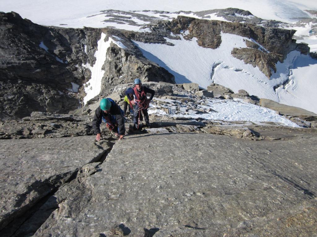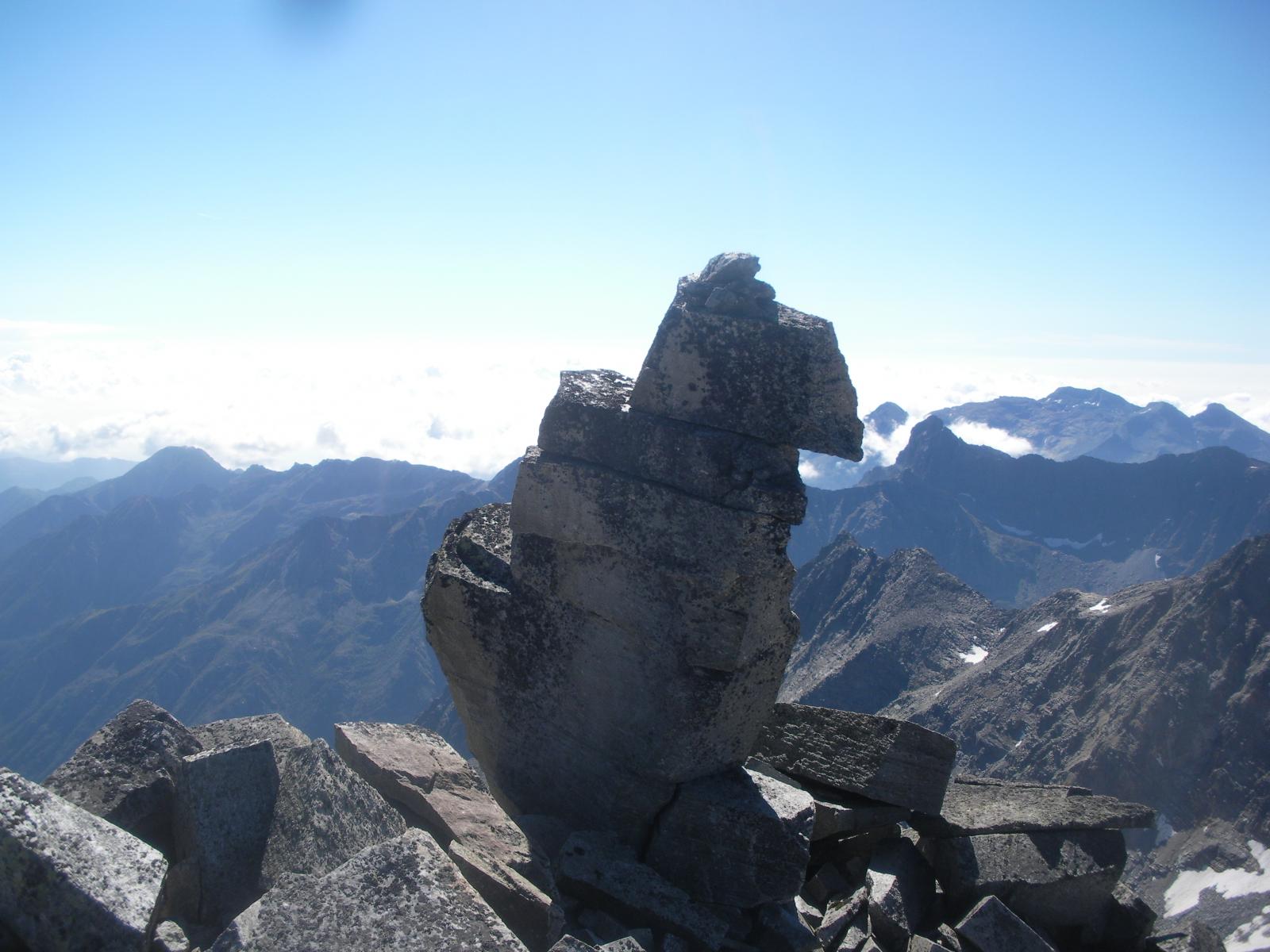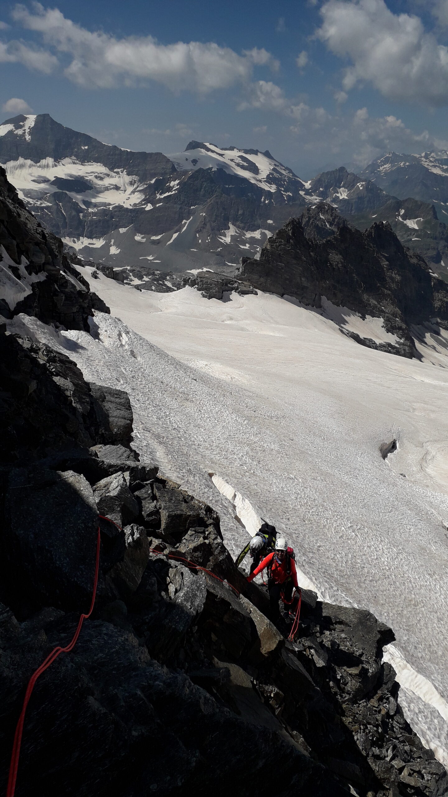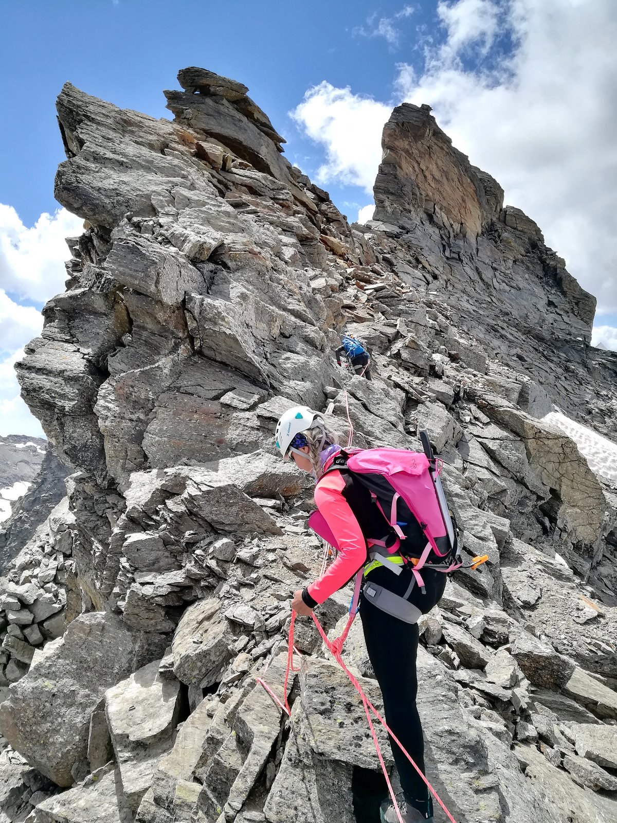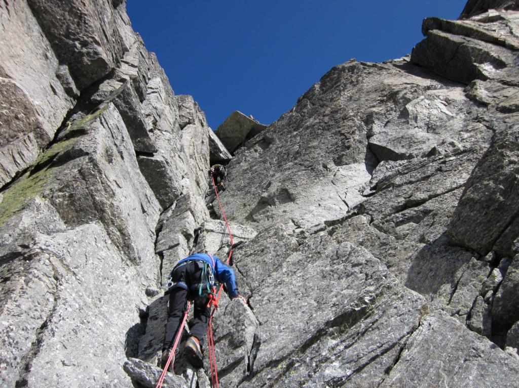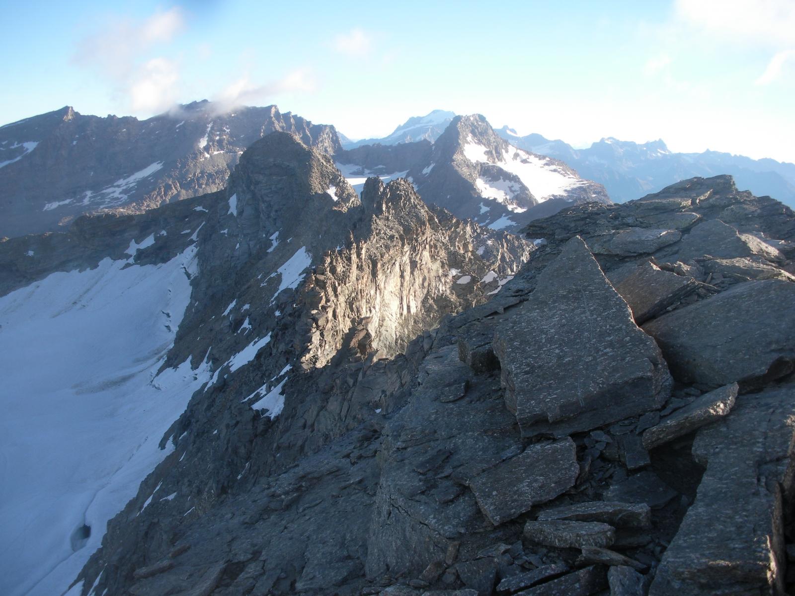 Continuare verso nord sulla cresta scavalcando con divertente arrampicata (max diff. III) i vari torrioncini che si susseguono, le cui difficoltà si possono anche evitare in parte tenendosi sul lato ovest su cengette alla loro base dove però la roccia è mediocre. Un pronunciato salto verso ovest (francia) si scende dal versante italiano, prima per una cengia verso sud poi per un’altra verso nord fino ad un intaglio che si scavalca portandosi sul versante ovest. Scendere un camino (al contrario risalendolo la difficoltà è III) con una doppia.