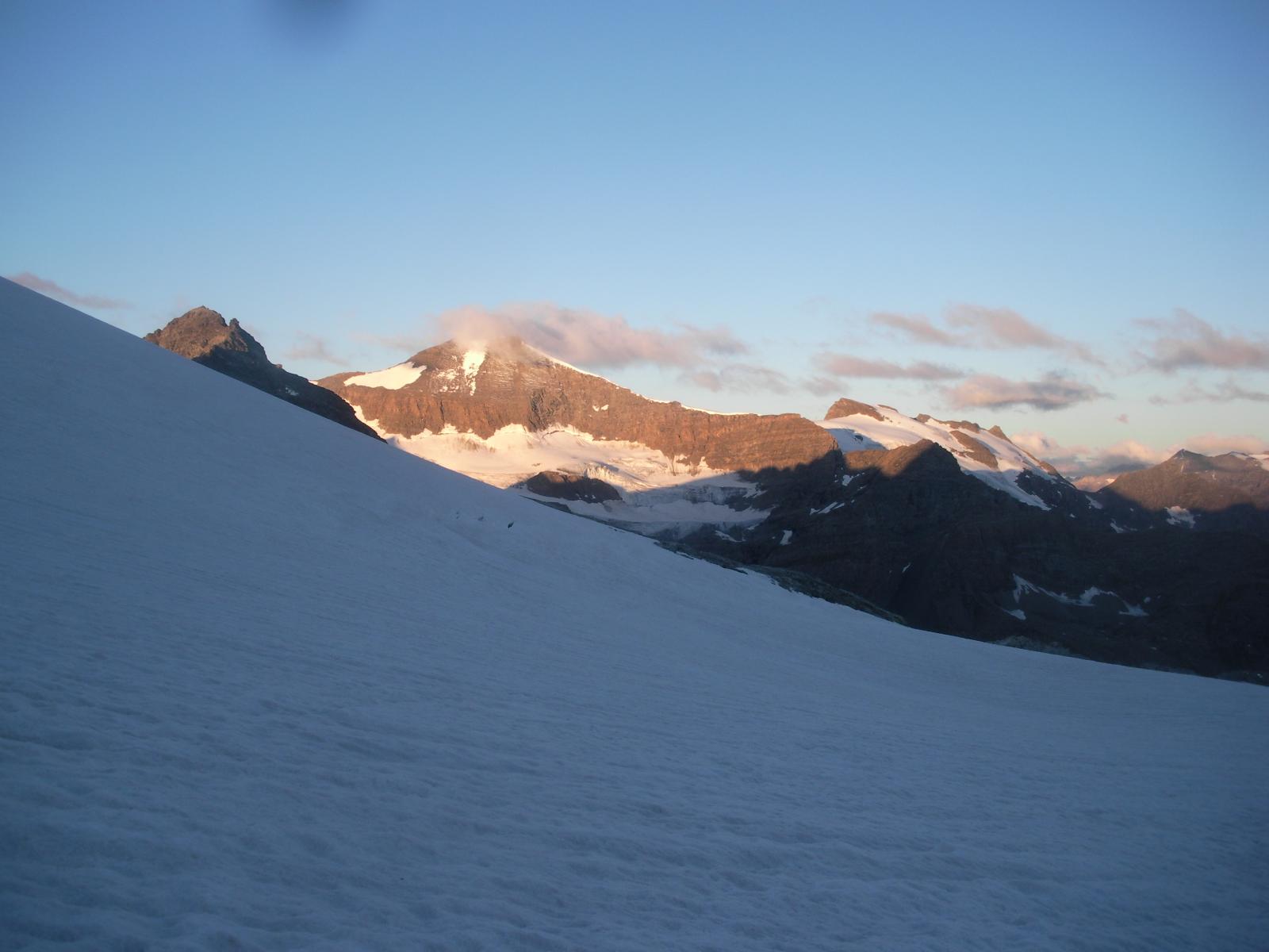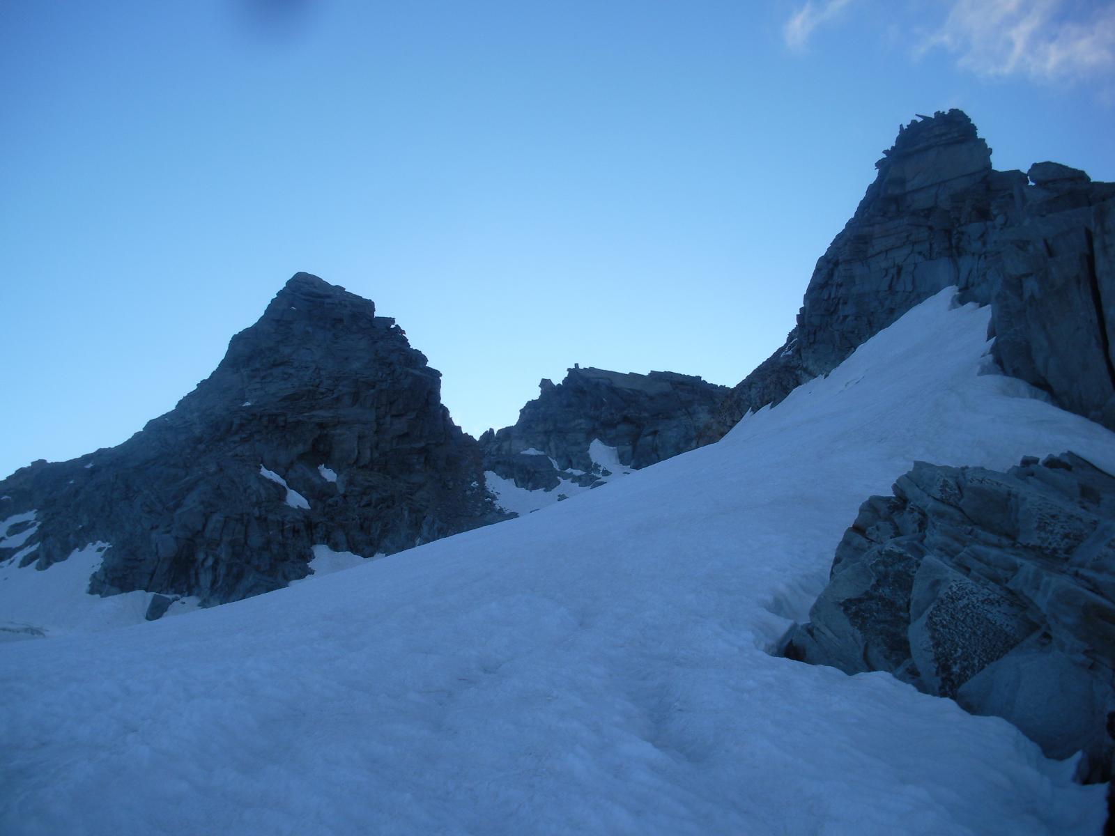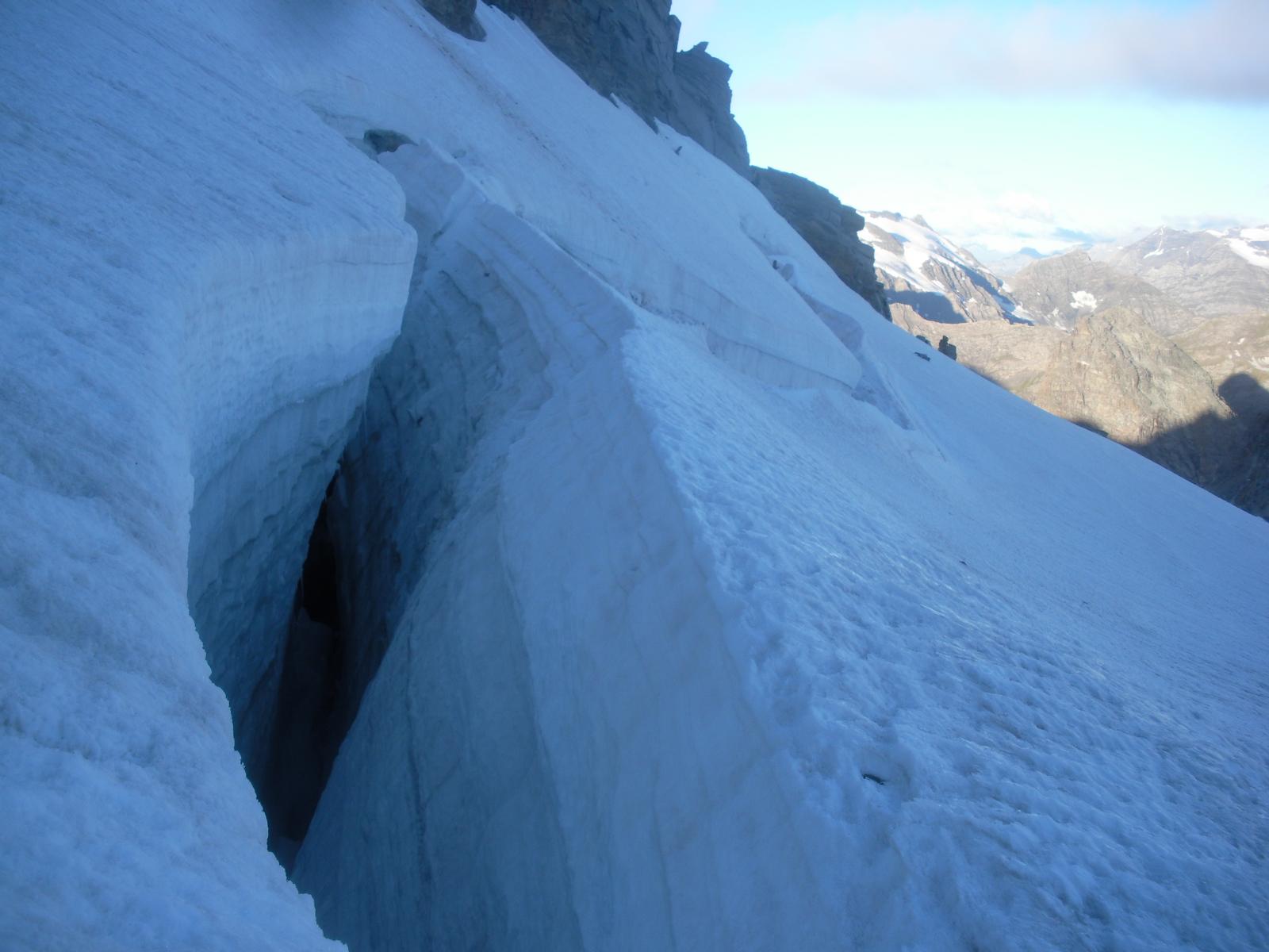 Scavalcare il Colle e tenendosi a destra proseguire sul ghiacciaio du Mulinet fino a giungere alla base del canale di sinistra (pendio ripido spesso in ghiaccio, terminale) che sbuca al Colle Nord della Gura m. 3.340.
