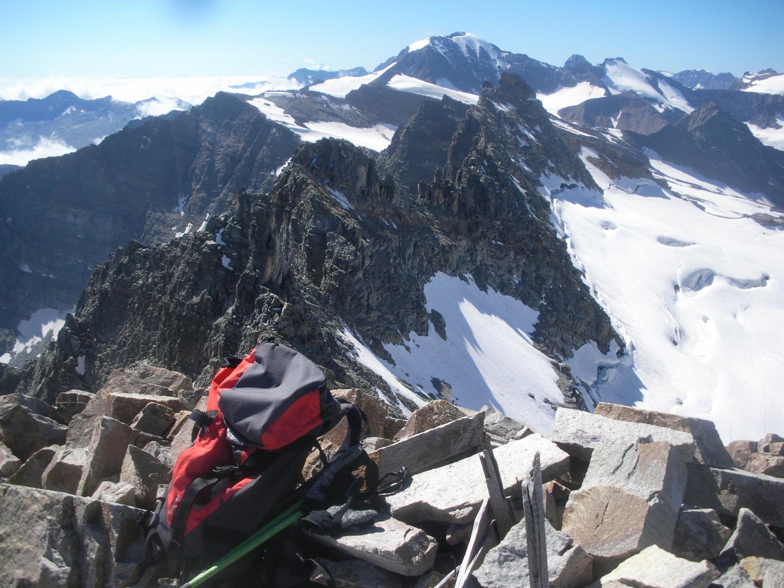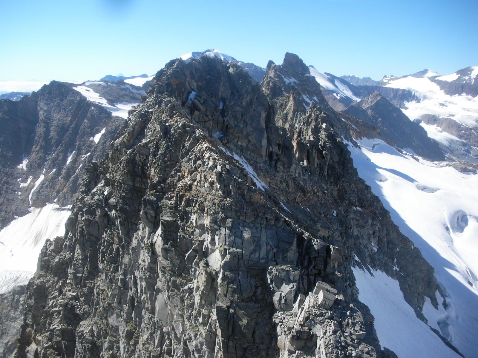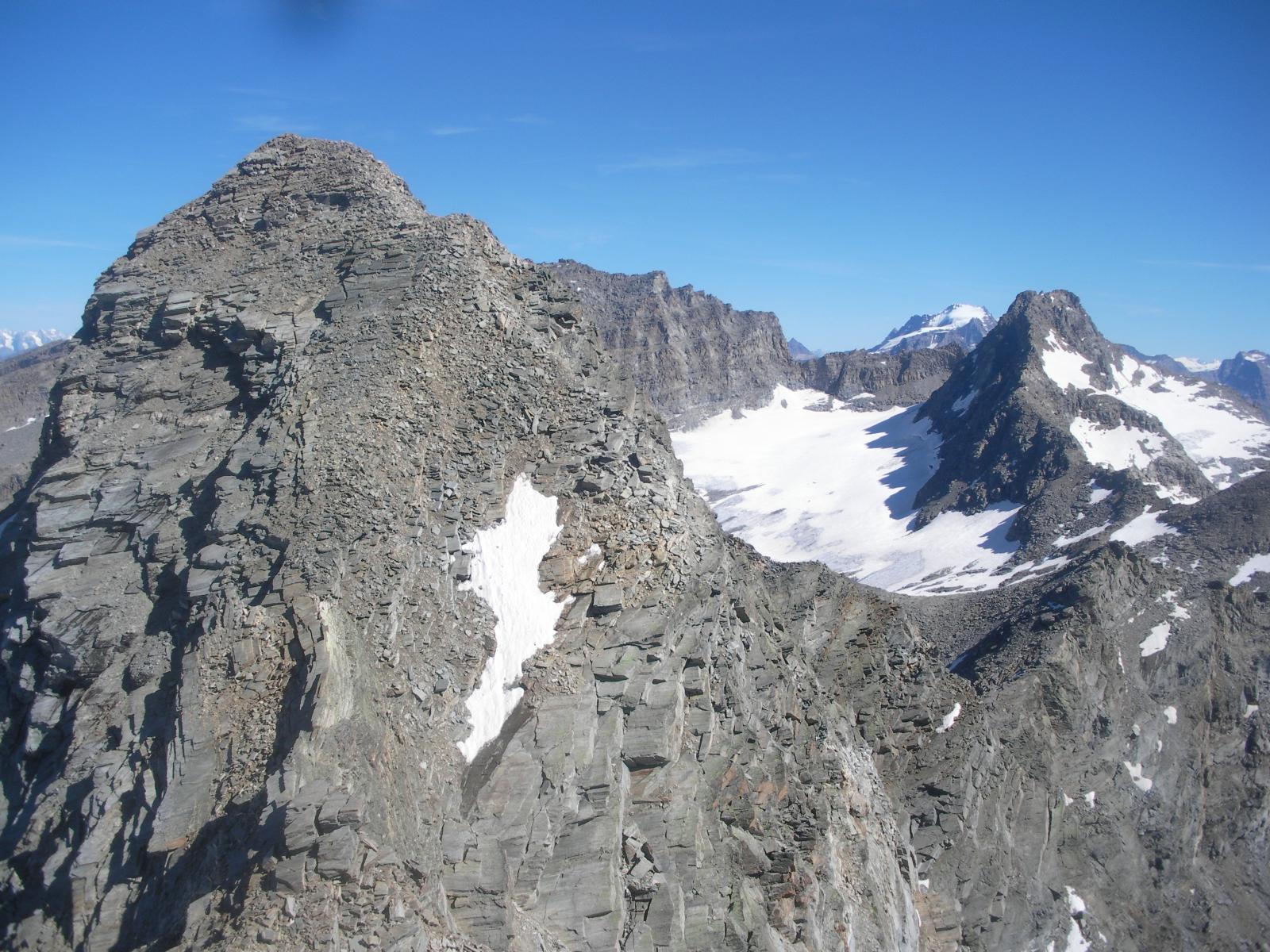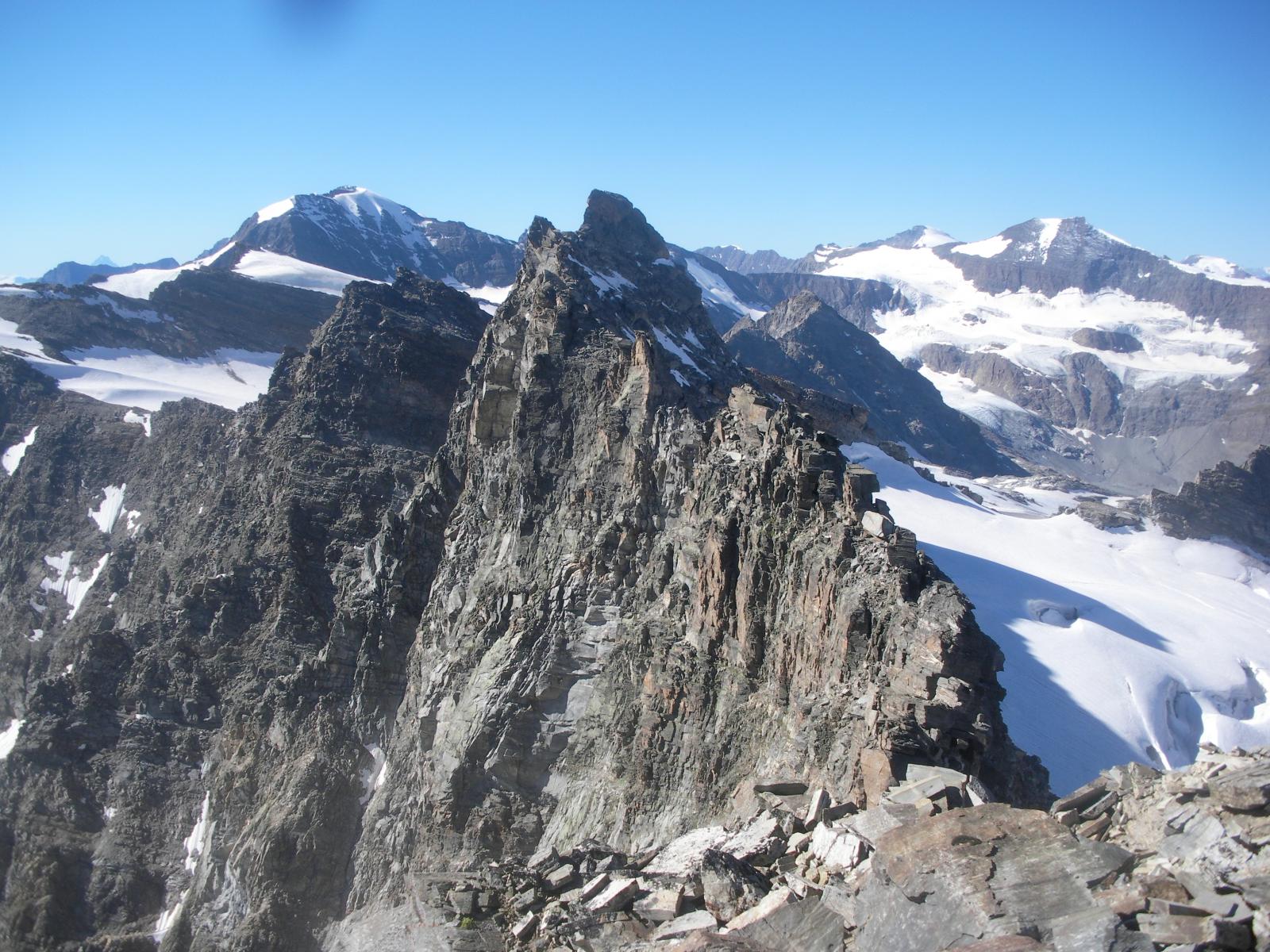 Proseguire sulla facile cresta fino alla Punta di Groscavallo m. 3.423, scendere la cresta nord di roccia mediocre fino alla Sella di Groscavallo e proseguire sulla cresta che segue incontrando alcune placche delicate (corda doppia in senso contrario) e successivi blocchi instabili spesso vetrati fino a giungere alla Dent d’Ecot m. 3.402 (ore 1,45 dalla Punta di Mezzenile).