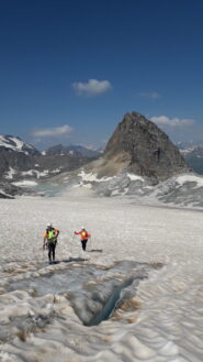 Per il ritorno due possiblità. a) attraversare il ghiacciaio del Mulinet verso sinistra (crepacci nel senso di marcia) fino al Col du Grand Mèan ed sul percorso di salita al rifugio des Evettes e l’Ecot; b) spostarsi sul ghiacciaio del Mulinet (crepacci) verso destra in prossimità del Col di Trièves quindi su morene e tracce di sentiero divallare fino agli chalets de Trièves a monte di l’Ecot.