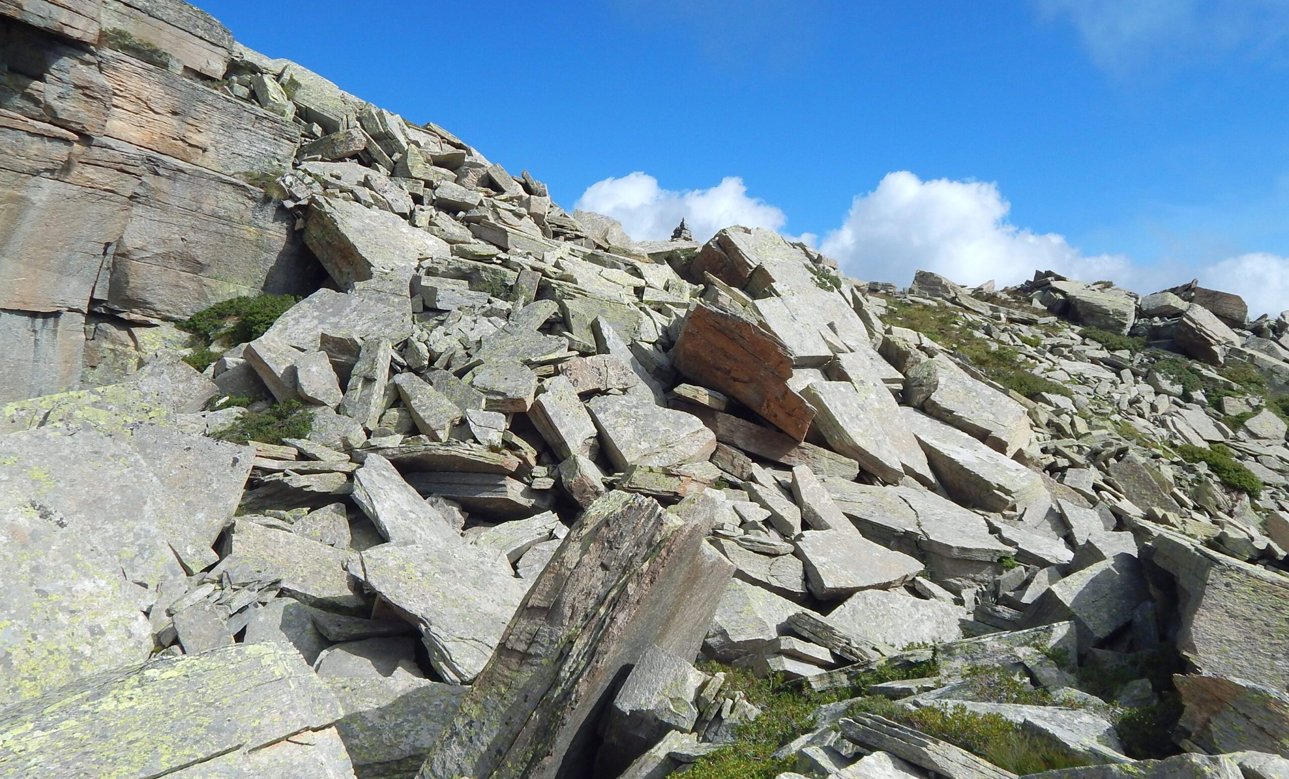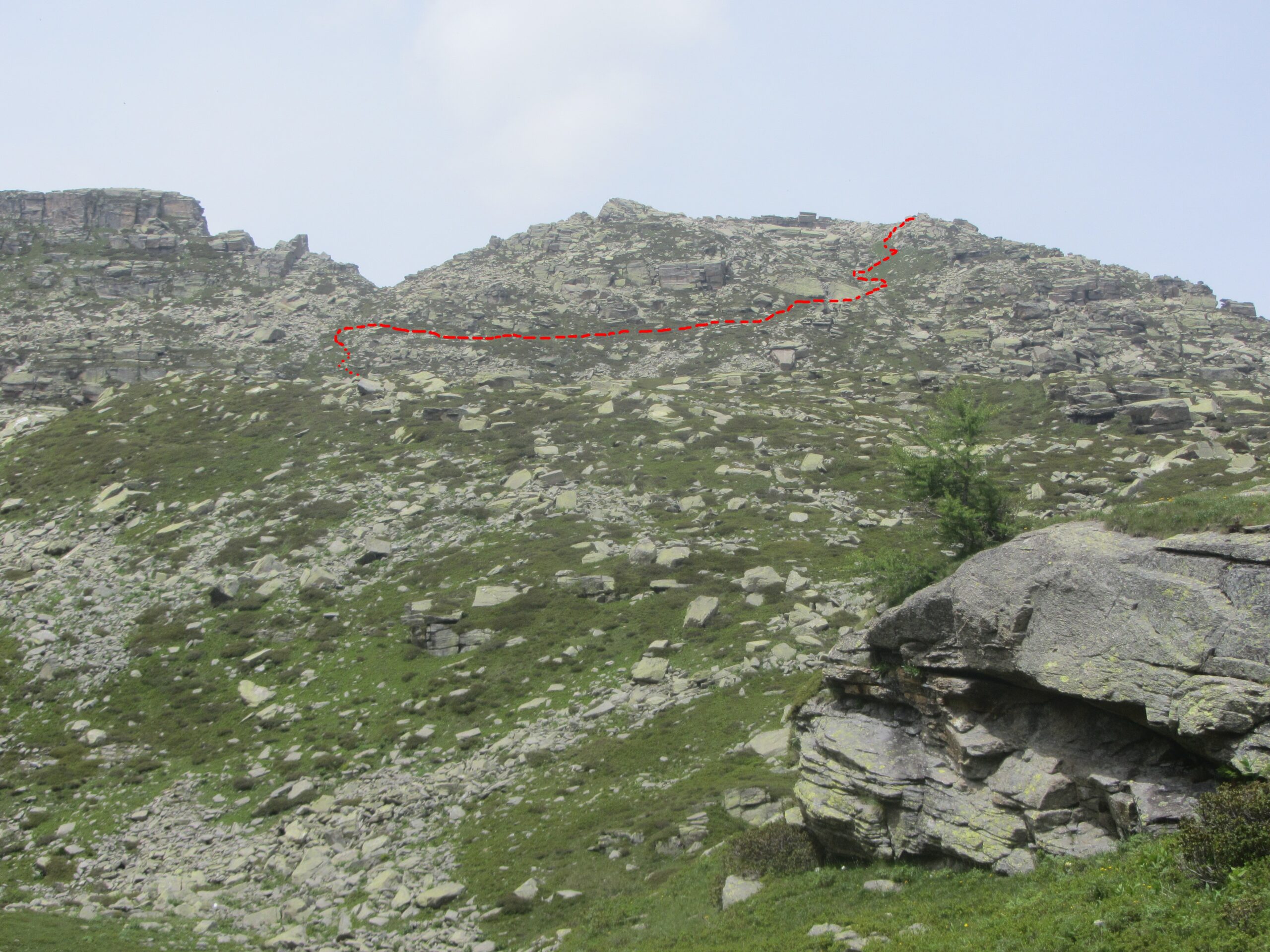 Procedere in salita verso sud puntando a un ripido canalino erboso che si sale fino a un colletto ai piedi della cresta sud della Cima Nonassa.