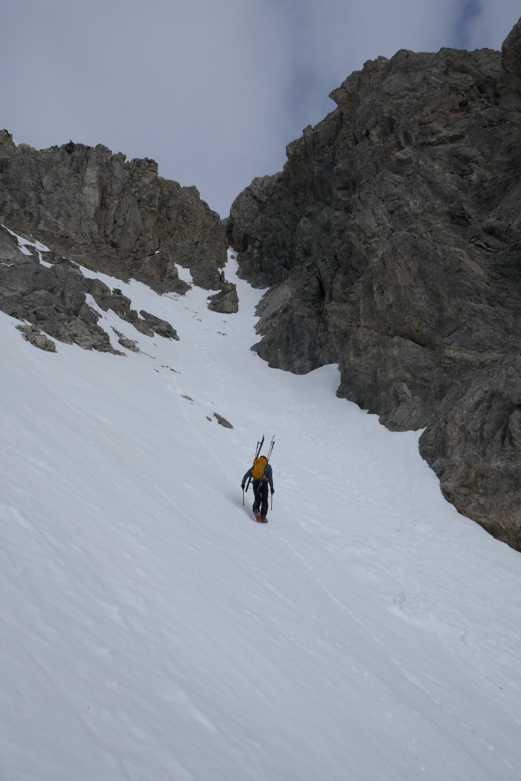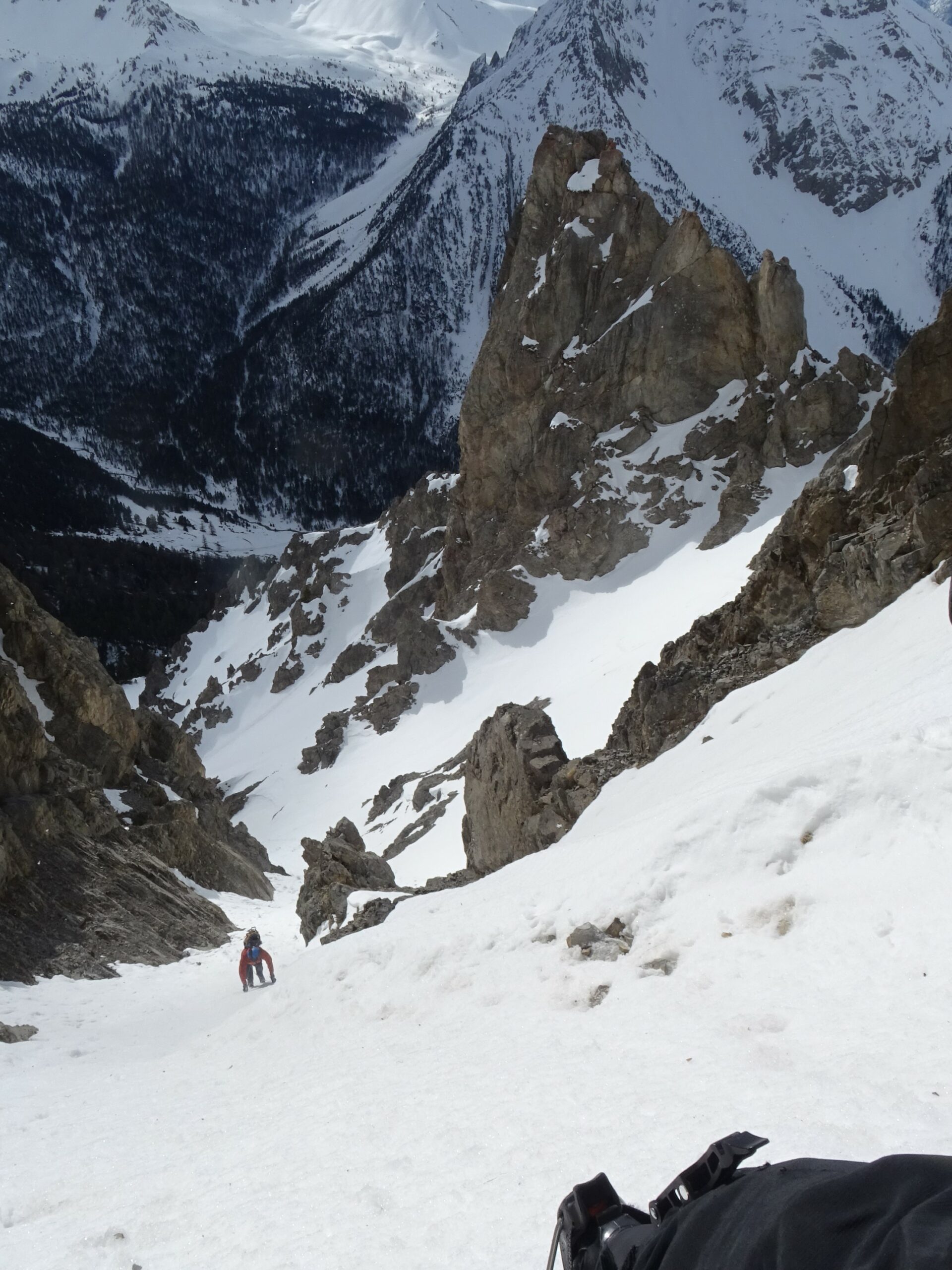 Dal Col des Acles sono circa 400m: 150m di conoide e circa 250m di canale, la prima metà a 40-45° e la seconda metà a 50° con alcuni strappi a 55°.