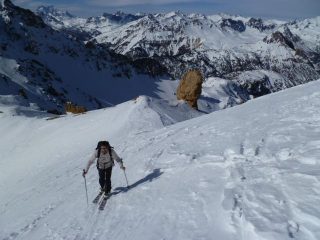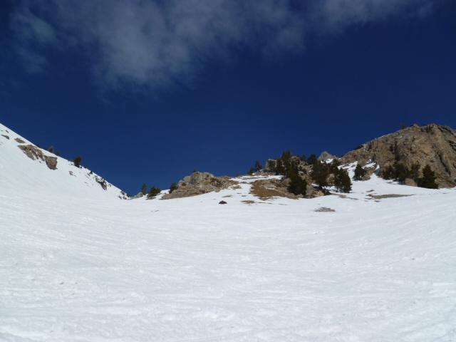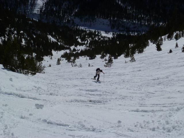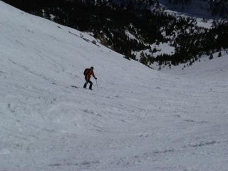 stradina ancora ben coperta, se dure il caldo non per molto però.. canale della suer e canale della mezzodi entrambi un po’ sfondosi… stanotte non aveva fato cosi caldo.. +2 a monginevro alle 8.30 .. gita primaverile con i versanti in pieno sud che si stannotrsformando ma mancano ancora un paio di giorni di smollamento e rigelo.. contropendenze versto est con crosta non portante verso ovest meglio.. scesi direttamente da poco sotto la punta con tratti a volte belli e trati con crosta e neve troppo molle.. proabilment econ le temperature di oggi anche senza scendere alle 13 come abbiamo fatto noi non cambiava nulla.. divertente i pendii tra i pinetti
