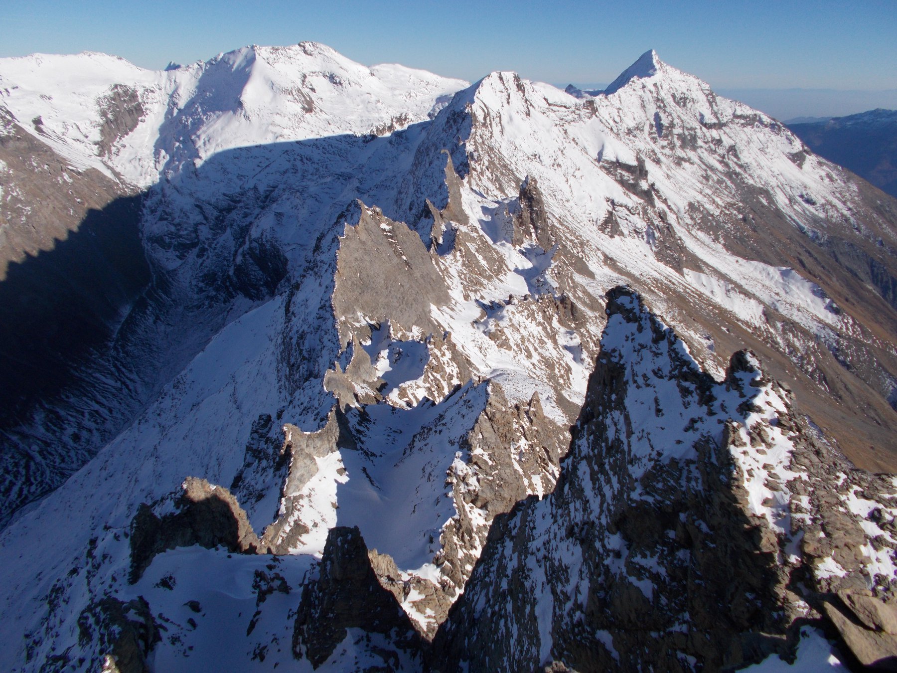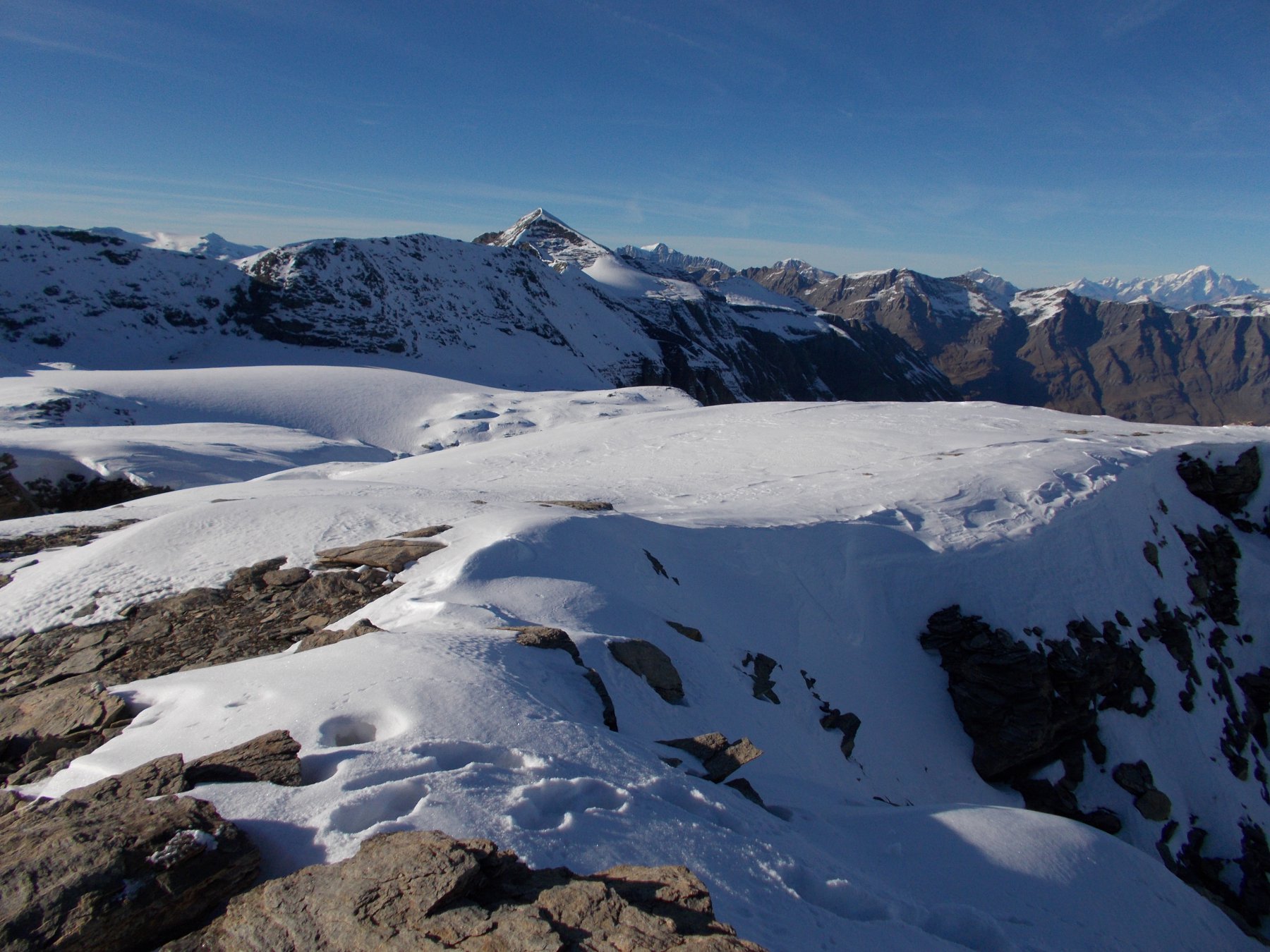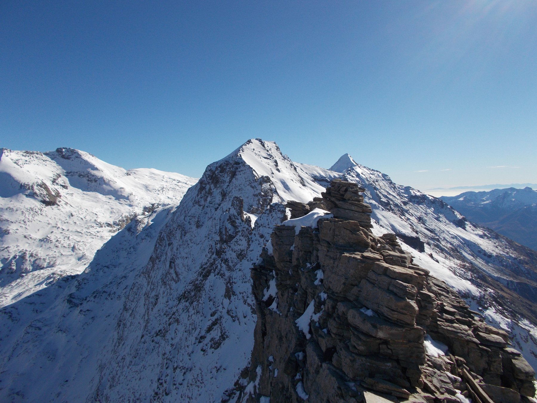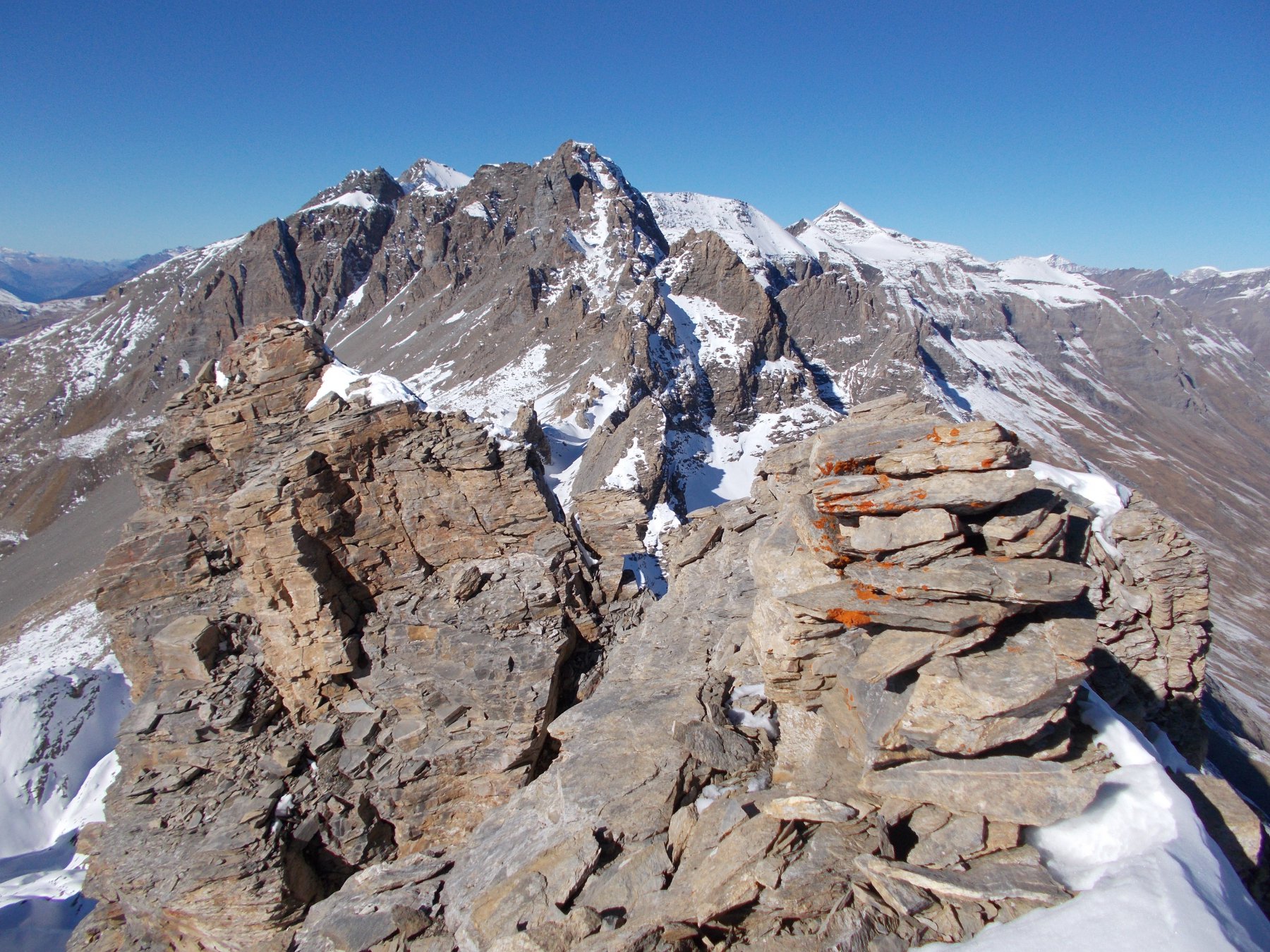 Bella veduta di qui sul vicino Rocciamelone e Charbonnel. Ritornare sui propri passi, e continuare per cresta non difficile ma esposta (in direzione nord-ovest), superando, o aggirando una serie di minuscoli pilastrini caratterizzanti il filo della cresta. Un ultima impennata al termine del tratto piu’ affilato della cresta sin qui percorsa, porta a toccare il vertice della cosiddetta Rocca Tour (3174m).