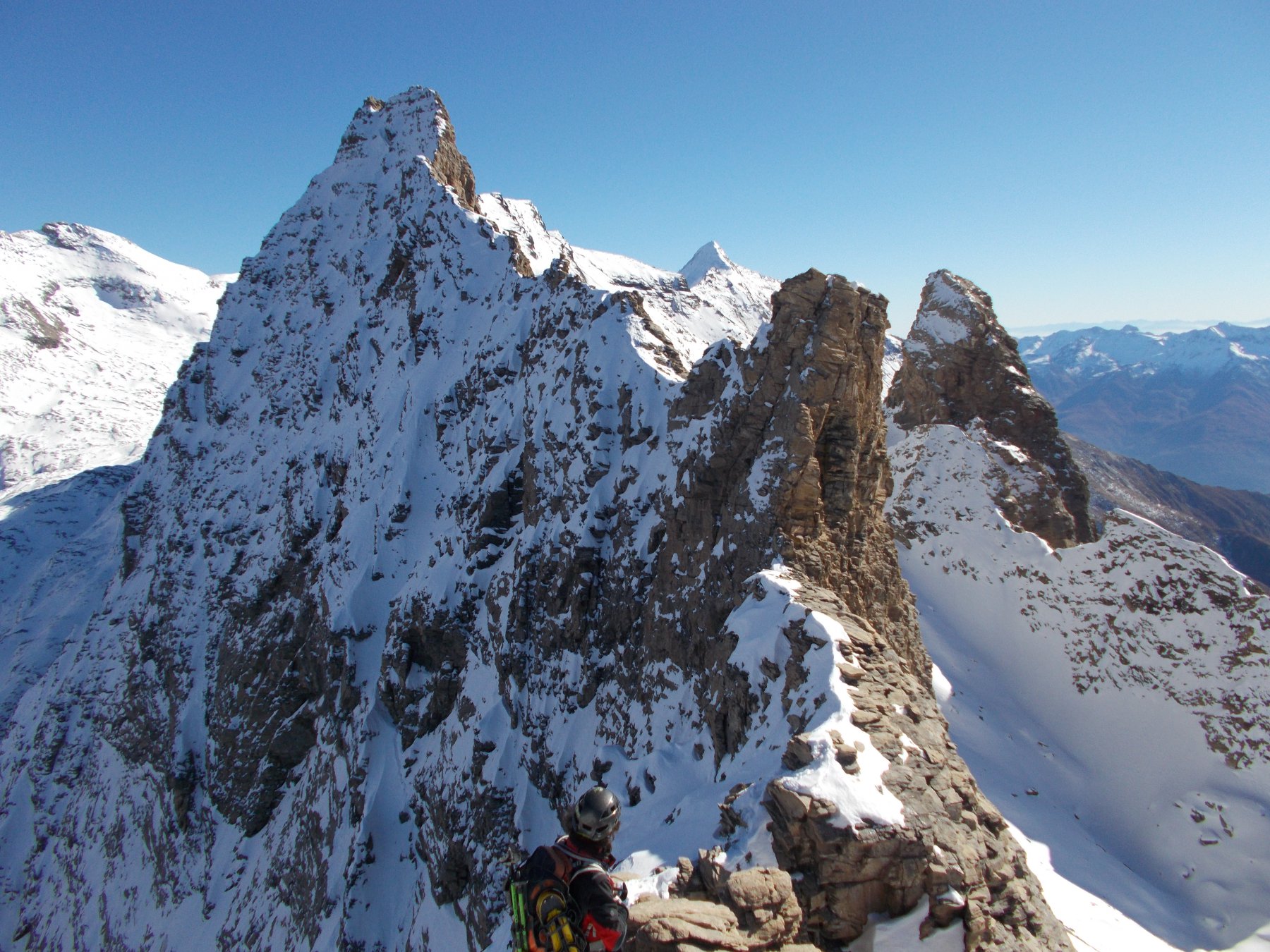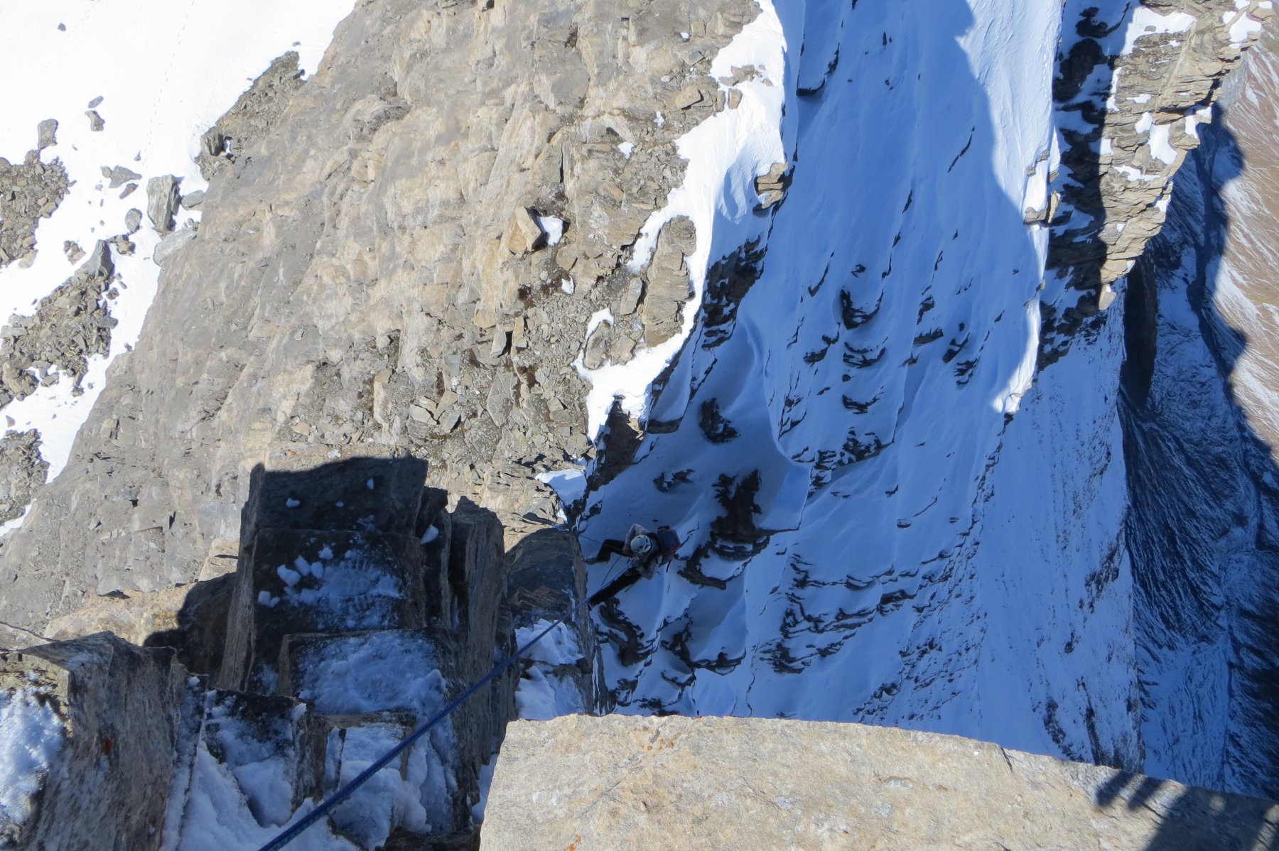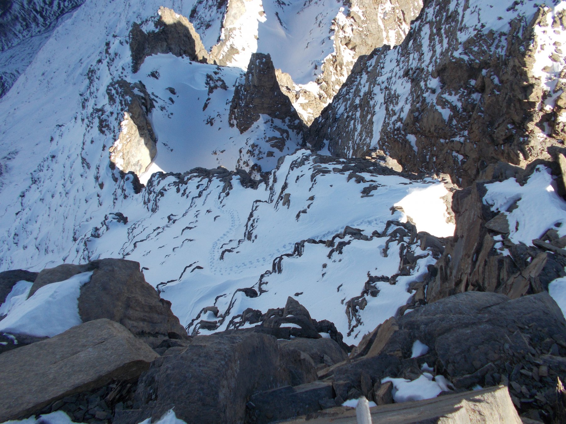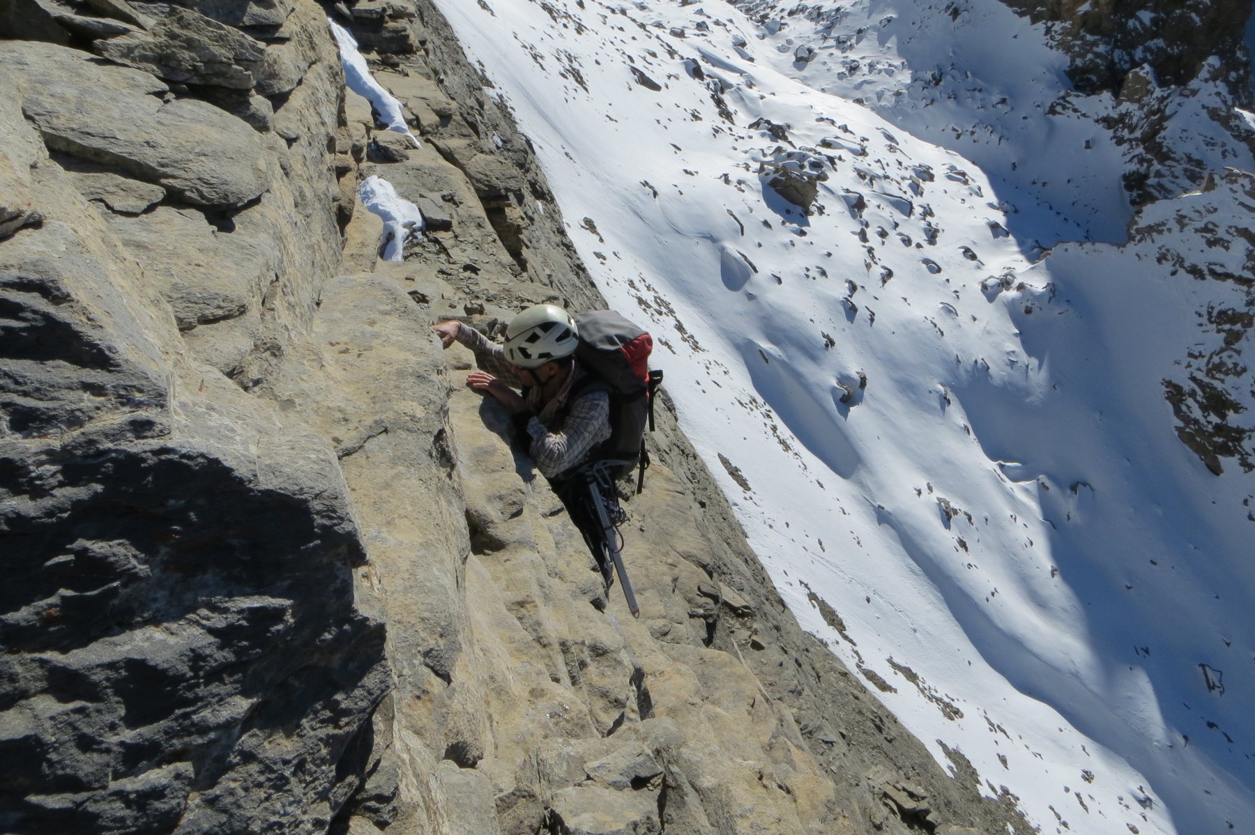 Da questa ardita torre posta pressapoco circa a meta’ dell’intero percorso, necessita scendere all’intaglio successivo con una doppia di una 20na di metri (ora attrezzata con cordino attorno a masso piatto). Il resto della traversata per velocizzare il restante ancora lungo cammino da fare e, restare nei tempi, conviene effettuarlo abbandonando il filo della cresta in un punto ove questa si discosta di poco dalla base per cenge e piccoli salti.procedendo vallette sospese (ricolme di neve fino a stagione inoltrata), fino alla base dell’ultimo imponente salto che caratterizza il fianco severo sud.est della Roche Michel.