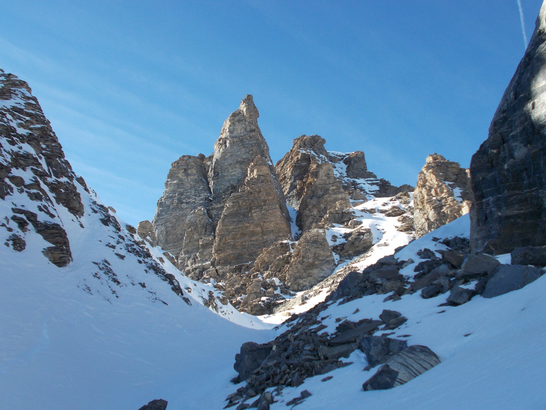 Ad un certo punto all’altezza di una forcella oltre la quale poco al di la e poco piu’ sotto si nota il rifugio Stellina, lo si abbandona, per risalire le ripide chine detritiche sovrastanti il Pian Ciardun, in direzione nord, puntando a entrare con percorso diagonale sotto cresta da dx verso sx, in una ampia conca pietrosa, con davanti l’ardito pinnacolo dei Trois Dents con la sua cresta sud.est strapiombante e a sx staccato, il bel dente di Novalesa. Portarsi in breve alla base della parete sud.ovest dei Trois Dents.
