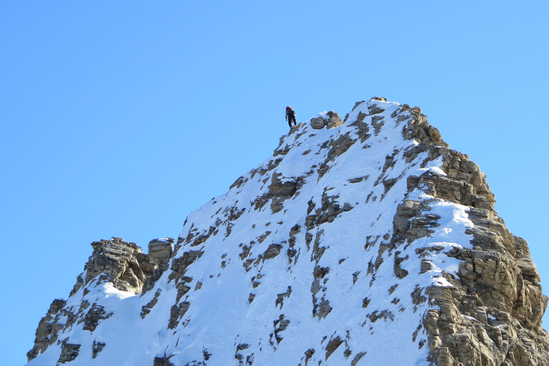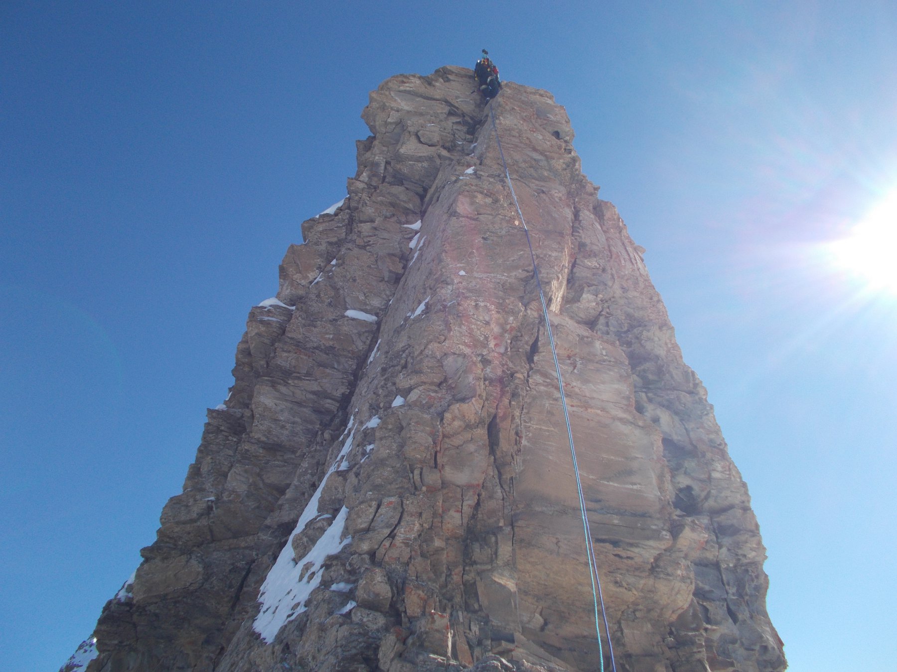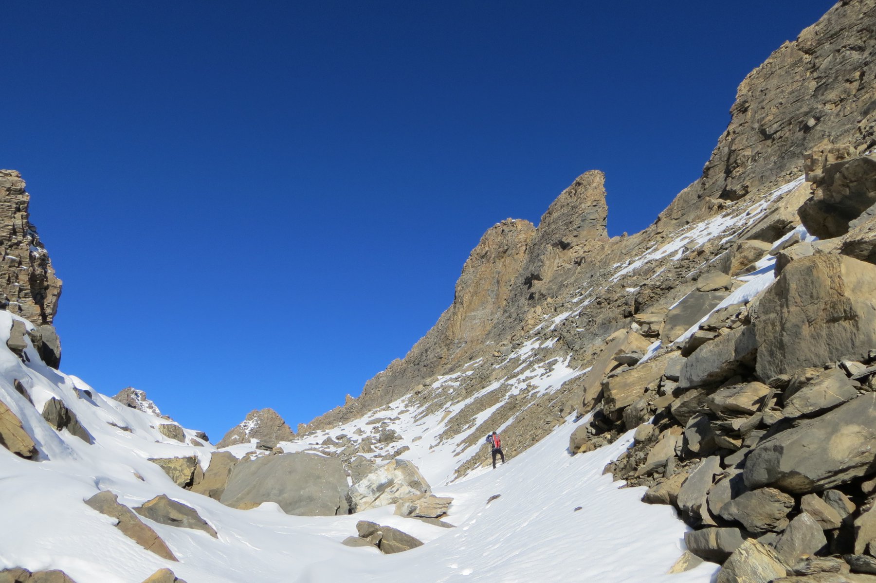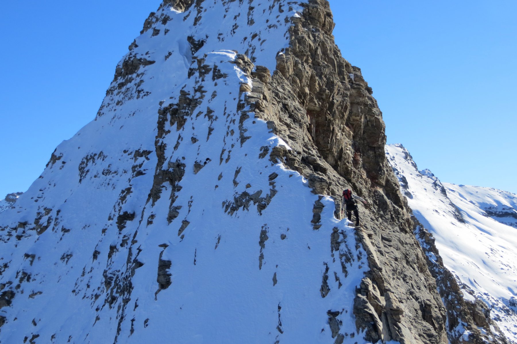 Ultima delle difficolta’ alpinistiche da affrontare, col superamento della parete canale che volge poi a cresta sul finale (pendio di neve fino a 50° e passi di III- nell’ultimo tratto di cresta rocciosa a sx prima del punto culminante (3429m).