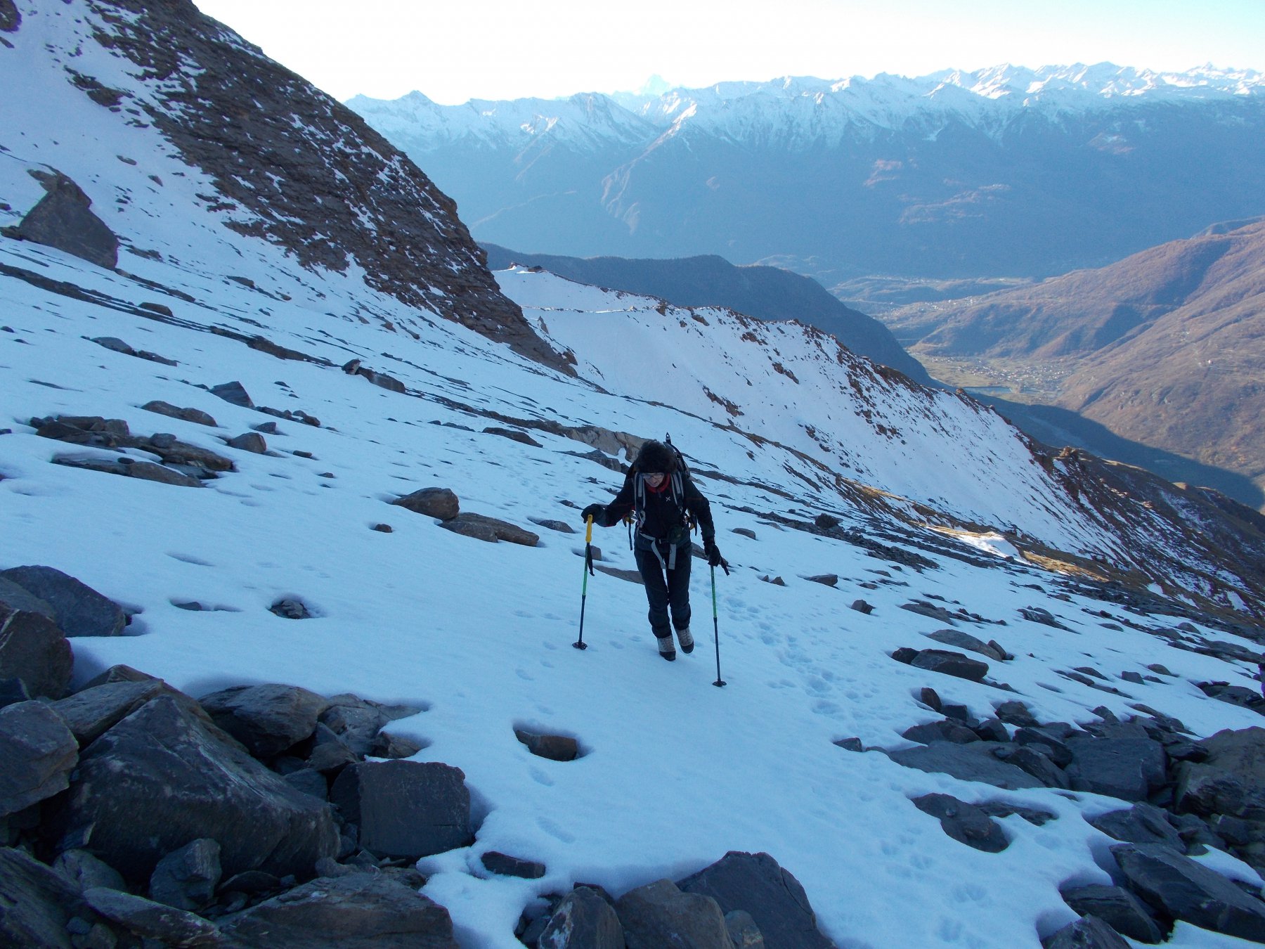 Abbandonarla in un punto qualsiasi per intraprendere a scendere in diagonale per scarpate detritiche e scivolose, badando a chiudere progressivamente l’anello in direzione sud-ovest fino a ritrovare la rotabile tramite la quale in breve si ritorna all’auto (dalle 10 alle 11 ore per il giro completo, soste compreso nelle modalita’ come descritto).