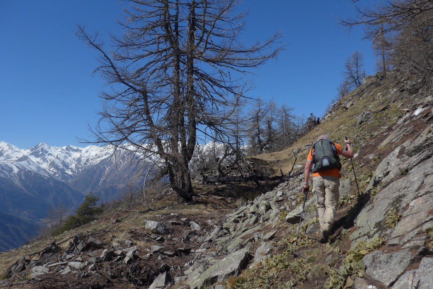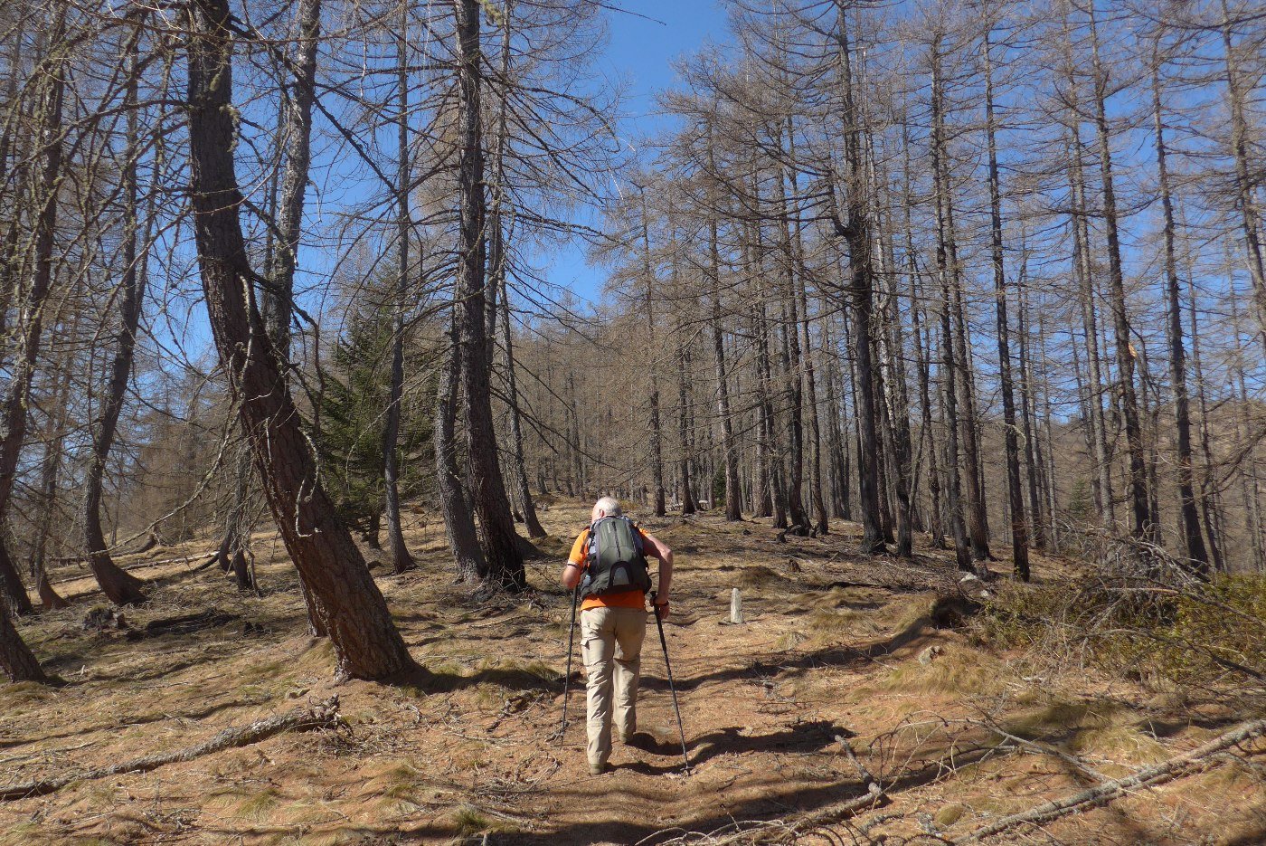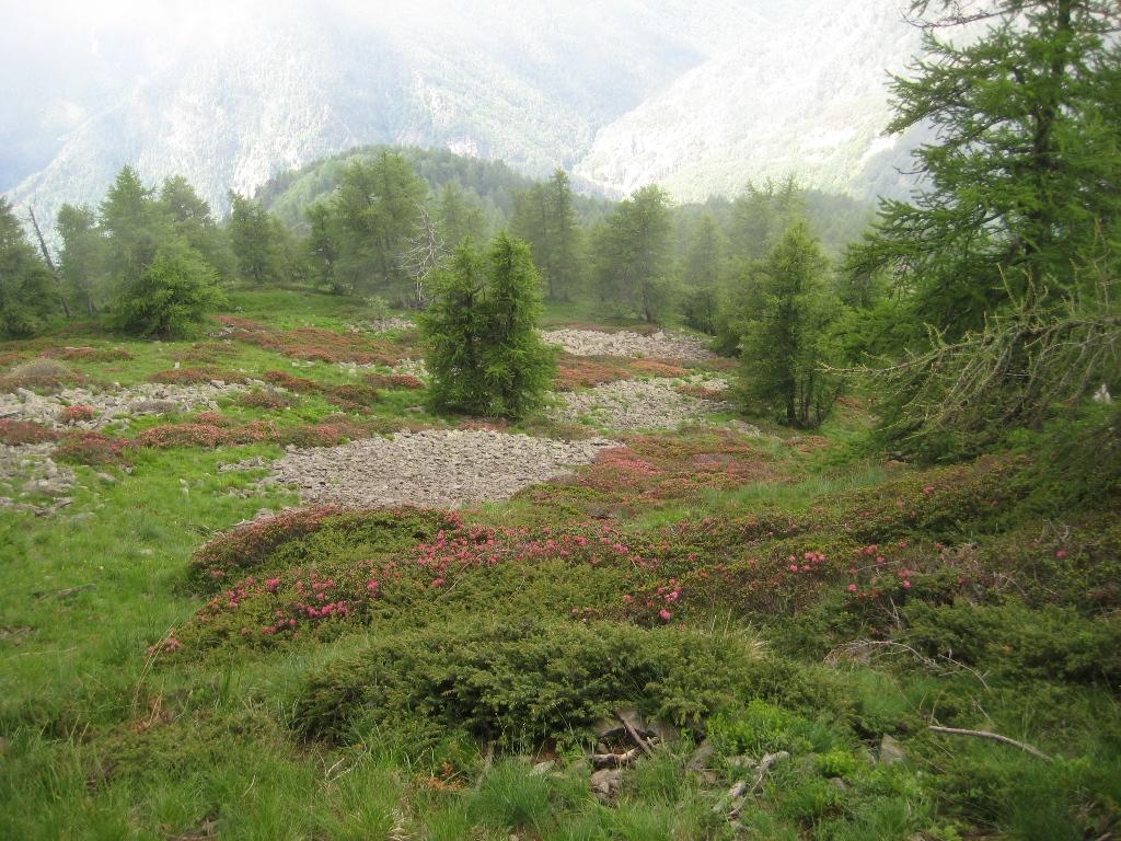 Lo si segue arrivando nella conca prativa vista all’andata. Da qui scendere decisamente verso sud-est. Il sentiero al momento attuale (marxo 2019) è spesso ostruito da piante cadute, ma ben segnato da ometti. Si raggiunge in breve la sterrata che si percorre lungamente fino a ritornare a Peyrone, chiudendo l’anello.