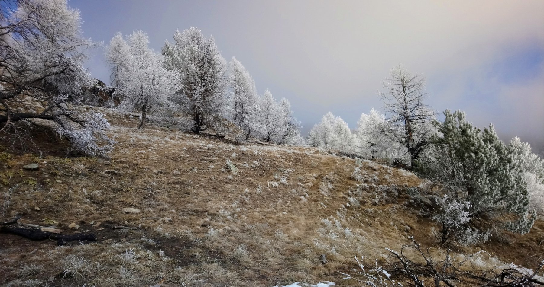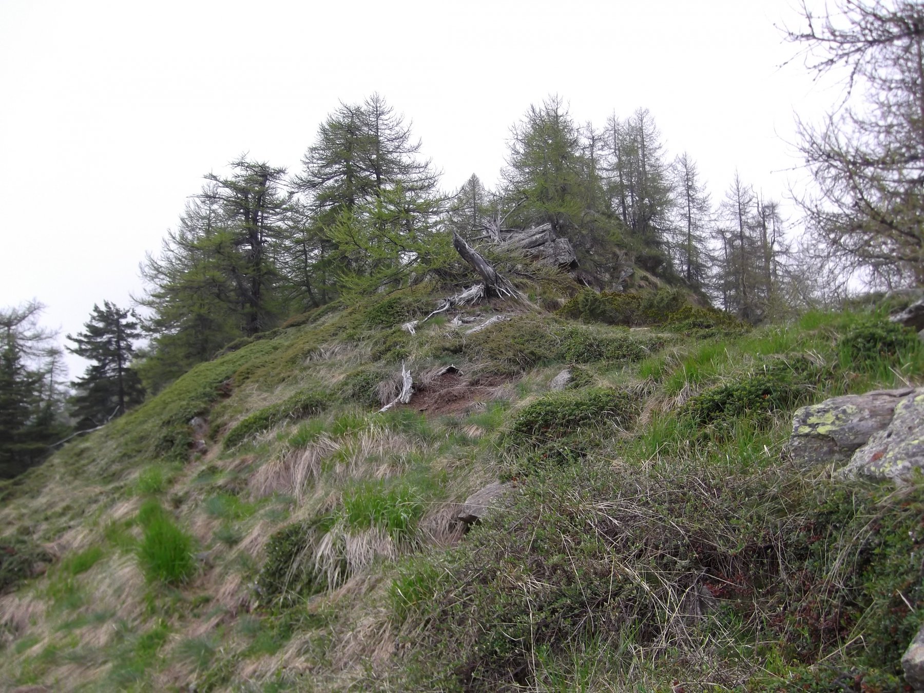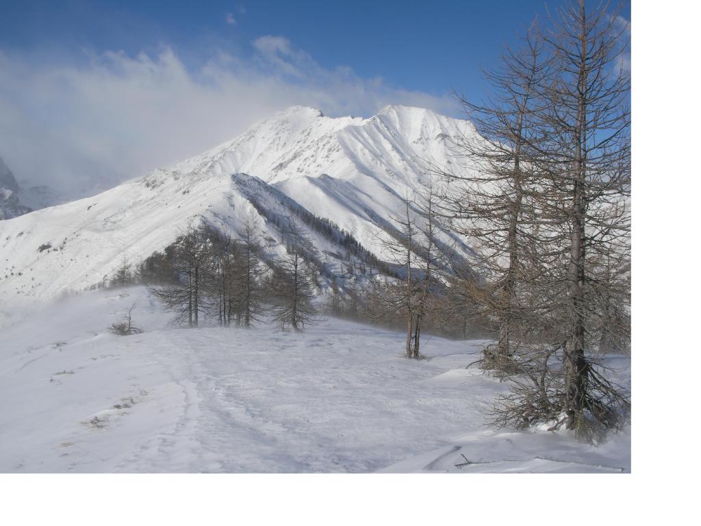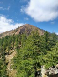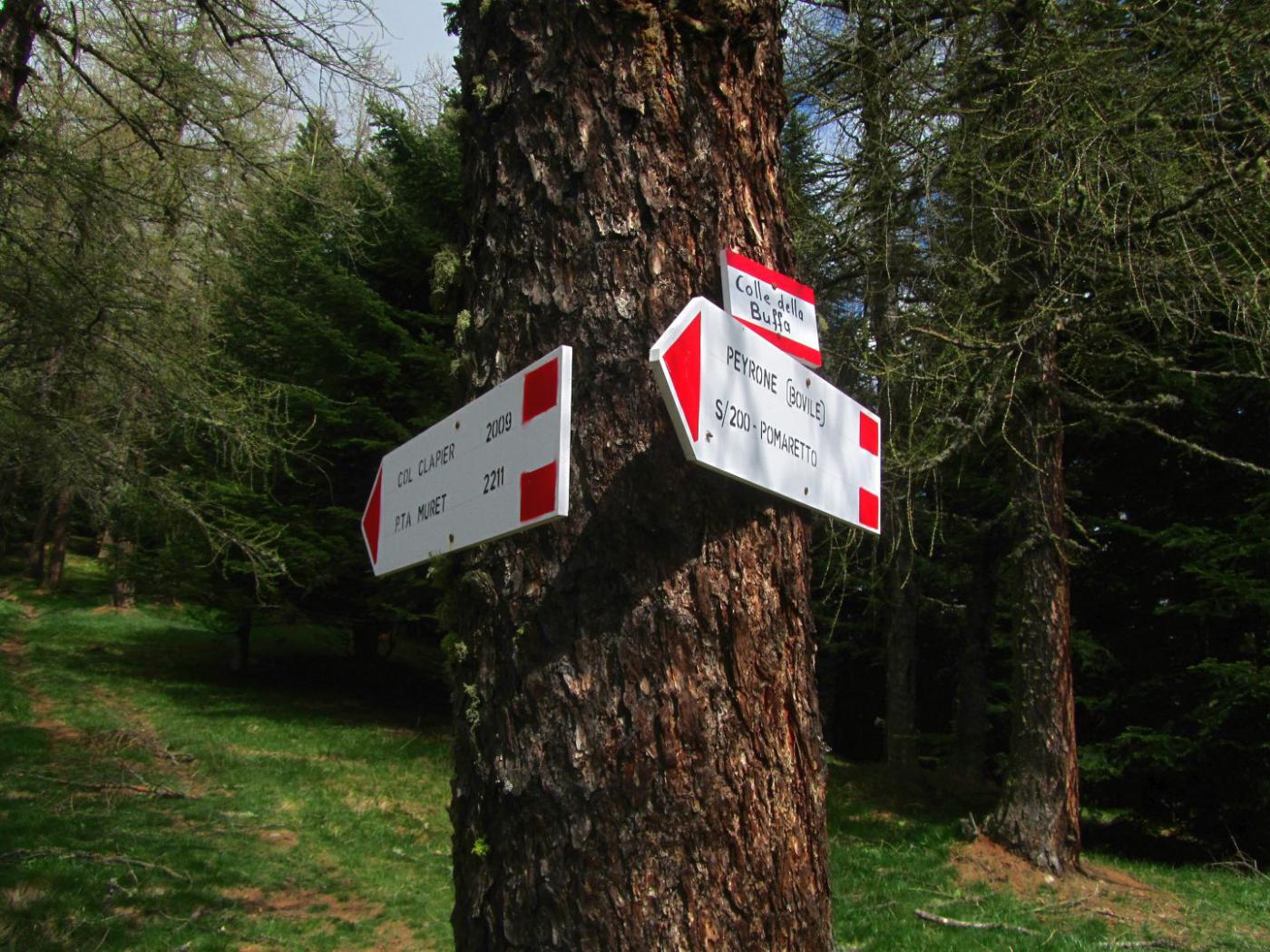 da Peyrone proseguire sulla sterrata fino ad incontrare sulla dx un bel sentiero (segni bianco/rossi), delimitato da un muretto a secco. Si sale nel bosco prima verso est , poi con un traverso verso nord-ovest nella pineta, raggiungendo in breve la dorsale e dopo poco il colle della Buffa 1678 m . Si prosegue sulla dorsale. Dopo poco il sentiero principale devia verso sud-ovest , indicazione Col Clapier, mentre si vede una piccola traccia che prosegue sulla dorsale. Seguire questa che sale prima nel lariceto, poi sotto la cresta ora più stretta. La traccia, sempre più esile si tiene sempre sul versante sud, pervenendo ad un tratto sopra un’ampia conca prativa. Salire sempre su esili tracce a destra guadagnando la cresta ora più facile. Si avvista un grosso ometto di pietre e lo si raggiunge con pendenze piuttosto ripide. Da qui si entra in un ampio pianoro, con parecchie piccole puntine. La punta Midi è l’ultima in fondo, contraddistinta da una croce.