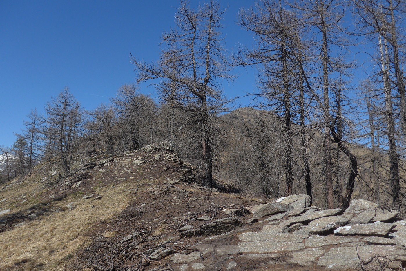 Attualmente (marzo 2019) tutto il versante nella parte alta è stato interessato da un ampio incendio, per cui le piccole tracce di sentiero sono quasi scomparse. Itinerario quindi da percorrere solo con buona visibilità.