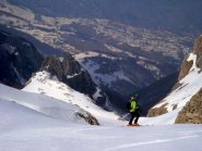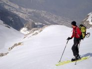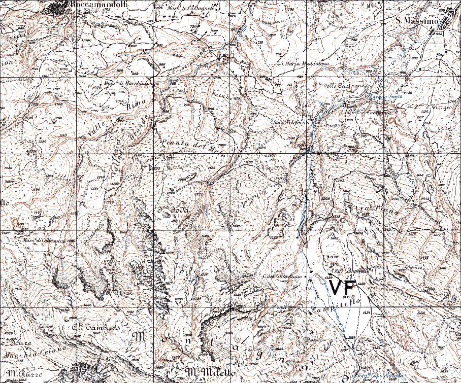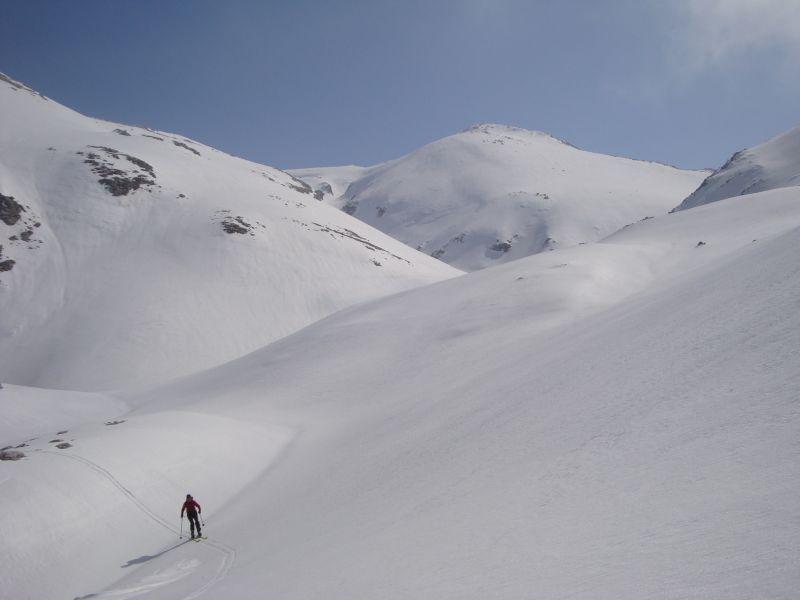 Si scende sul versante N,nella V. Fondacone (Funnecone),grande canalone situato tra il Miletto e Colle Tamburo.A circa metà vallone un crestone roccioso (sul quale si elevano i due Campanarielli,di valle e di monte) divide la valle in due bracci:facile quello di sx,impraticabile quello di dx.Tenersi quindi obbligatoriamente alla sx orografica sotto le pendici del Colle Tamburo.Con ripida discesa si raggiunge lo Stazzo di Campanariello (1615 m. circa),sella erbosa situata a cavallo di due vallette,sotto la guglia di monte,in ambiente severo,dominato dalle alte pareti della cresta N del Miletto.Si continua dunque a sx dei Campanarielli per una costa ripida e boscosa.Ancora in un bosco di stupefacente bellezza,largo e sciabilissimo fino ad incrociare una forestale ed ancora più giù ,più o meno fino alla quota di M.1250 circa.Qui diritti non si può più proseguire in quanto il Fondacone continua roccioso per confluire nella V. Grande. Bisogna quindi uscire dalla valle sulla sx orografica (seguendo i segnali rossi del sentiero) e risalire con un traverso circa 40-50 m. di dislivello per raggiungere una sella sulla dorsale che delimita la sx orografica.Si scende da qui ancora a sx nella V. Rima raggiungendo infine una sterrata.Questa conduce in circa 1 Km al paese di Roccamandolfi.