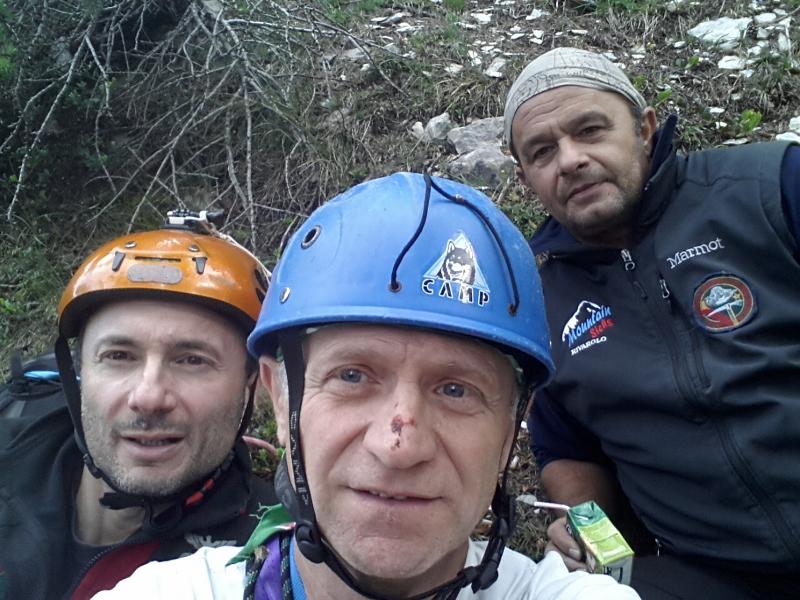 Con Piero (l’esperienza non è acqua fresca!) e Luigi. Oggi super affollamento: altre tre cordate dietro di noi. Assolutamente sconsigliato salire sotto altri: troppe le scariche inevitabili di pietre (il mio naso ne sa qualcosa!)e comunque tempi di attesa lunghi nei passaggi impegnativi. Roccia compatta solo da metà fino alla fine della via De Albertis. Dopo le piogge recenti, i primi due tiri sono letteralmente fradici e scivolosi, anche per via della terra che si calpesta. Poi, ancora qualche zona bagnata, specie sull’ultimo tiro impegnativo della Rivero, prima della cresta finale. Per tutti e tre c’è stata possibilità di gloria ma soprattutto per Piero, che si è sciroppato tutta la De Albertis, con i tiri bagnati e i più impegnativi. Morale: va bene che è una via storica (che stoffa gli apritori!) ma una volta…..basta e avanza, perché a mio avviso, è veramente pericolosa.