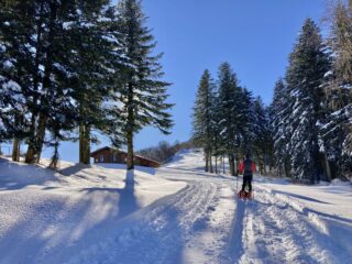 Neve continua dal parcheggio, ma le condizioni meteo di ieri hanno rovinato i primi due terzi della gita. Sopra: qualche bella curva in farina. Sotto: una crosta infame ci ha costretto a seguire le stradine e i solchi dei gatti al lavoro. Nonostante il fondo quasi assente, non abbiamo toccato pietre. Giornata e vista spaziali.