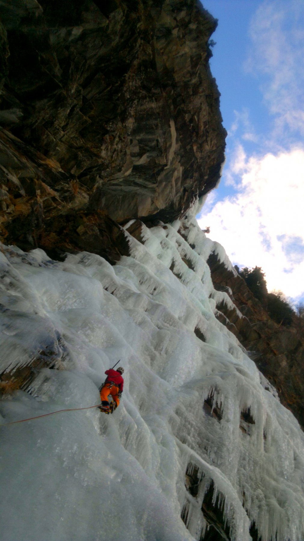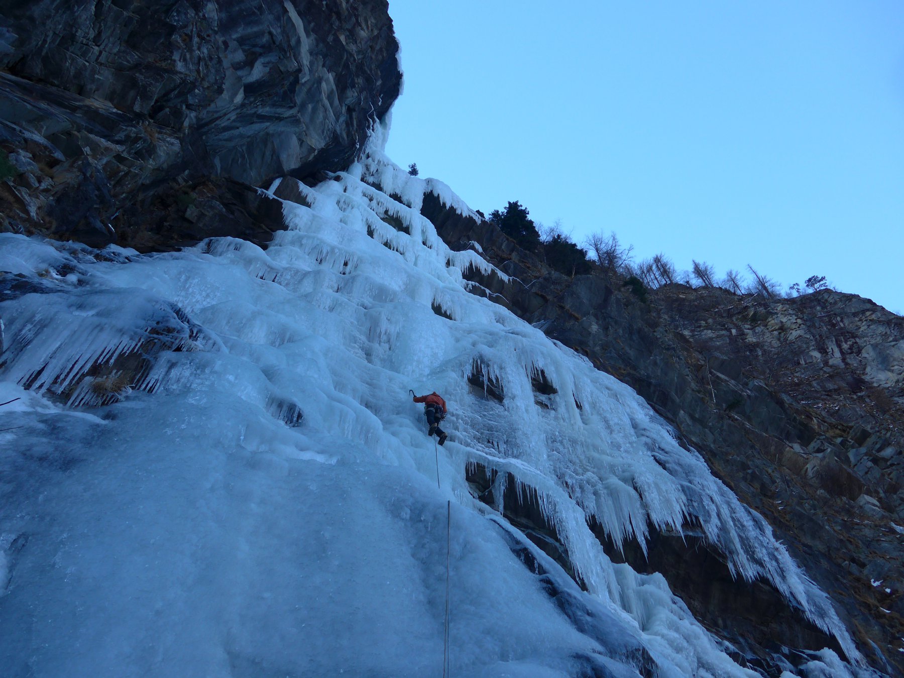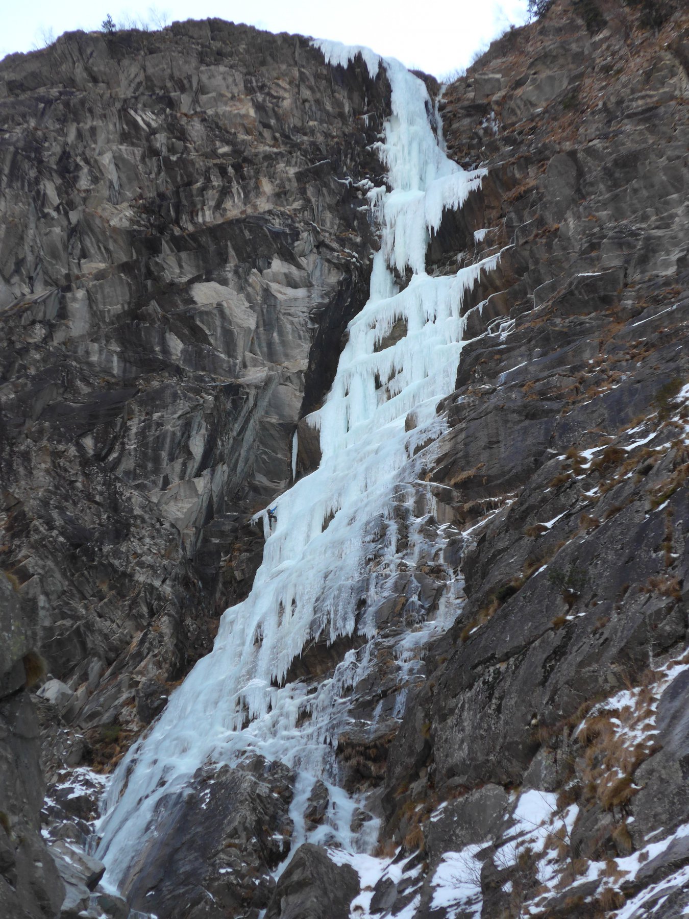 La prima doppia si effettua su fix, la seconda su Abalakov, ed il primo tiro si può aggirare a sinistra traversando nel bosco. Attenzione la cascata è assai esposta al pericolo di valanghe ed è raro trovarla in buone condizioni data la quota relativamente bassa. Siamo partiti troppo presto… 3 ore da macchina a macchina con Lallo.
