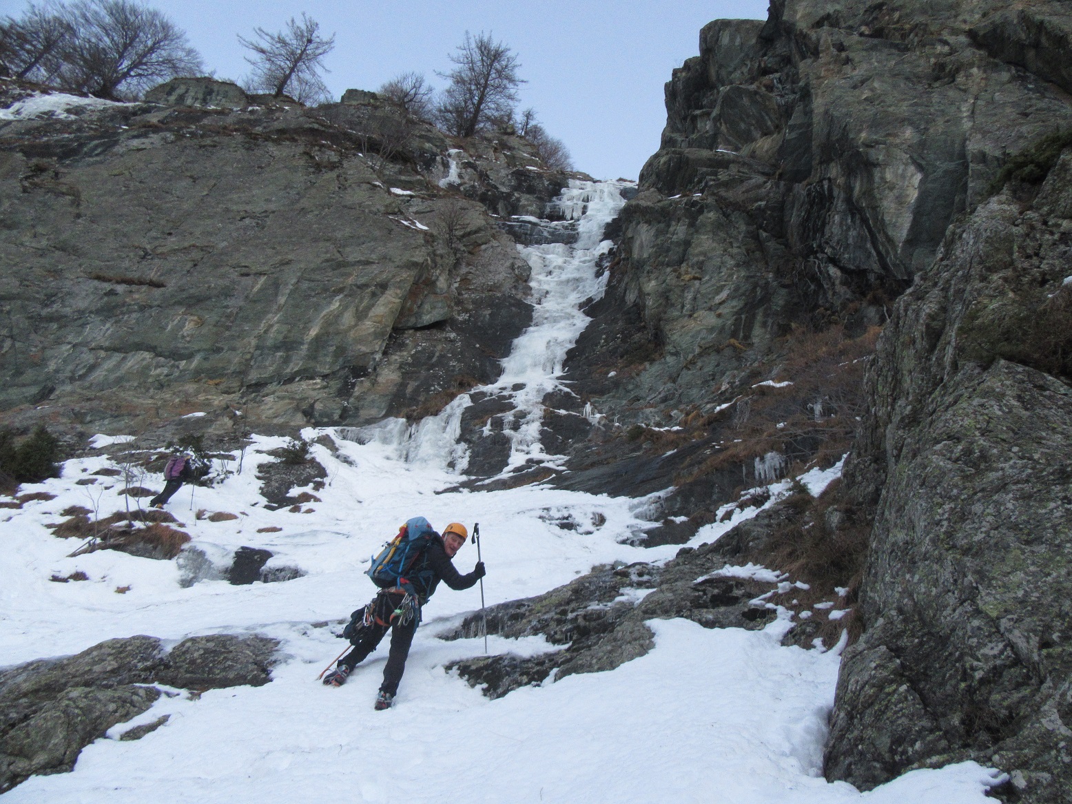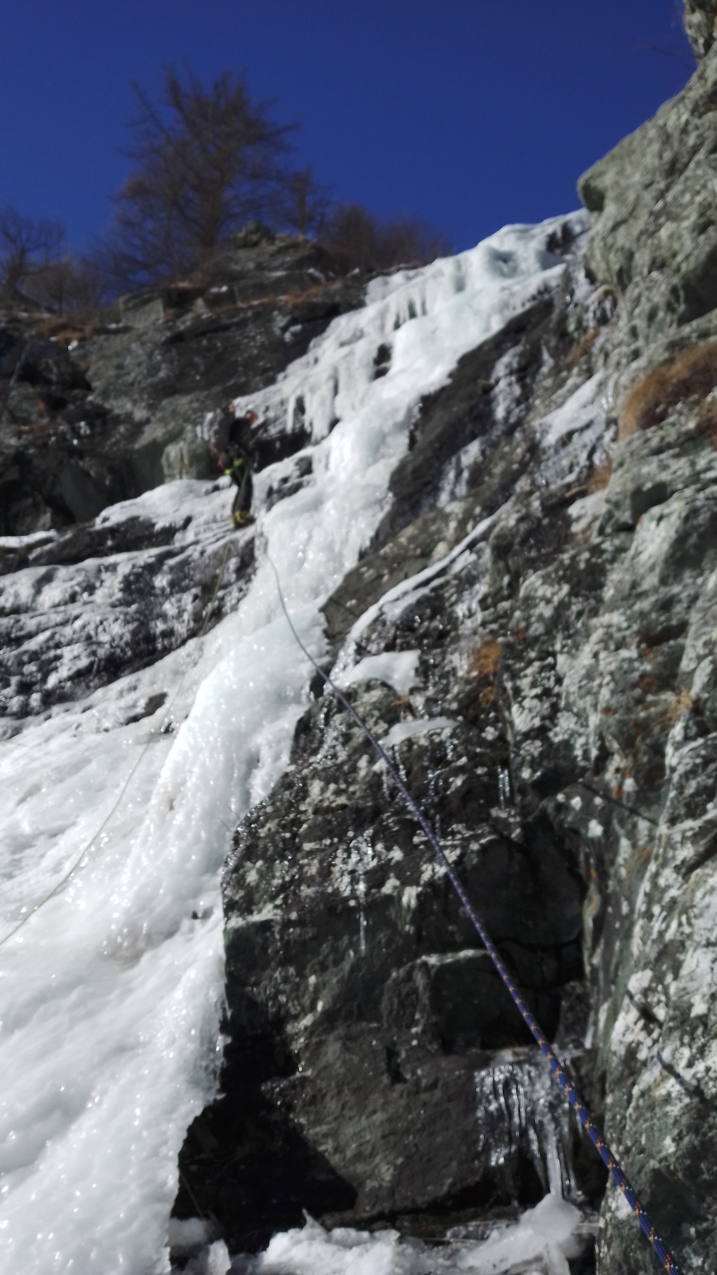 - L2 45m 80° max sosta al centro del canale a dx del ghiaccio (fix e cordone)