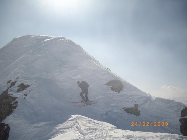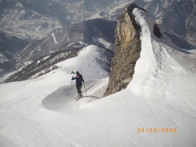 In discesa con neve sicurissima si può scendere direttamente dalla selletta lungo un ripido canalone (visibile dal basso).