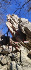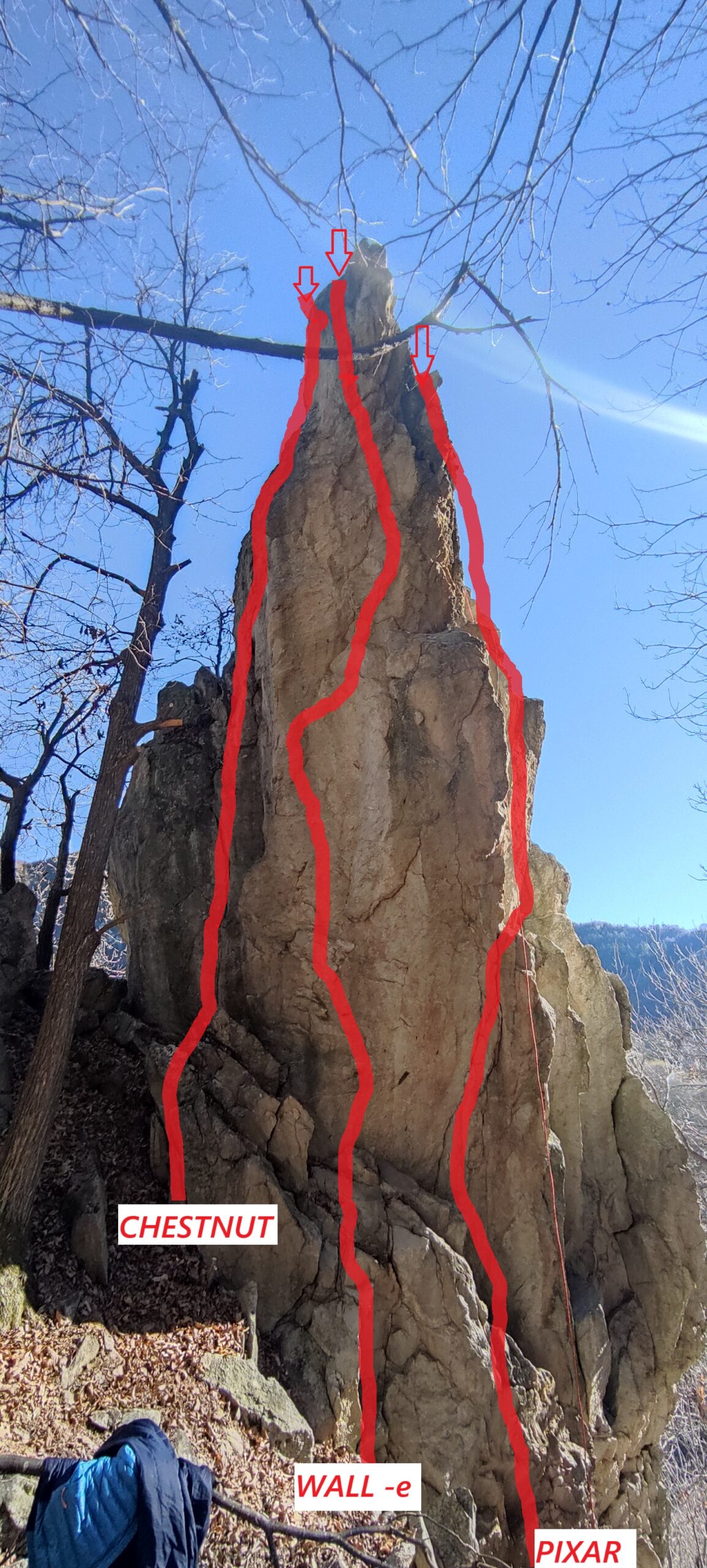 - CHESTNUT (A1+) : direttiva della fessura verso sinistra. partenza su aluhead e buona fessura per friend a sx, seguire la fessurina ora più piccola che punta a sx, uscita su placca con sequenza ben calcolata di buoni cliff e fessurine varie , in sosta con passo in libera facile.
