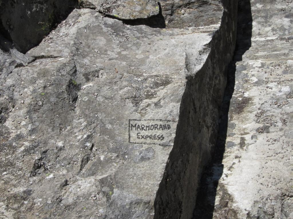- Andare a sinistra su uno spigolino e ribilanciarsi su alcuni gradini creati dalla roccia assai lavorata dall’acqua 5c, quindi piegare a destra su una placca biancastra 5a, che progressivamente abbatte fino alla S2, su due spit.
