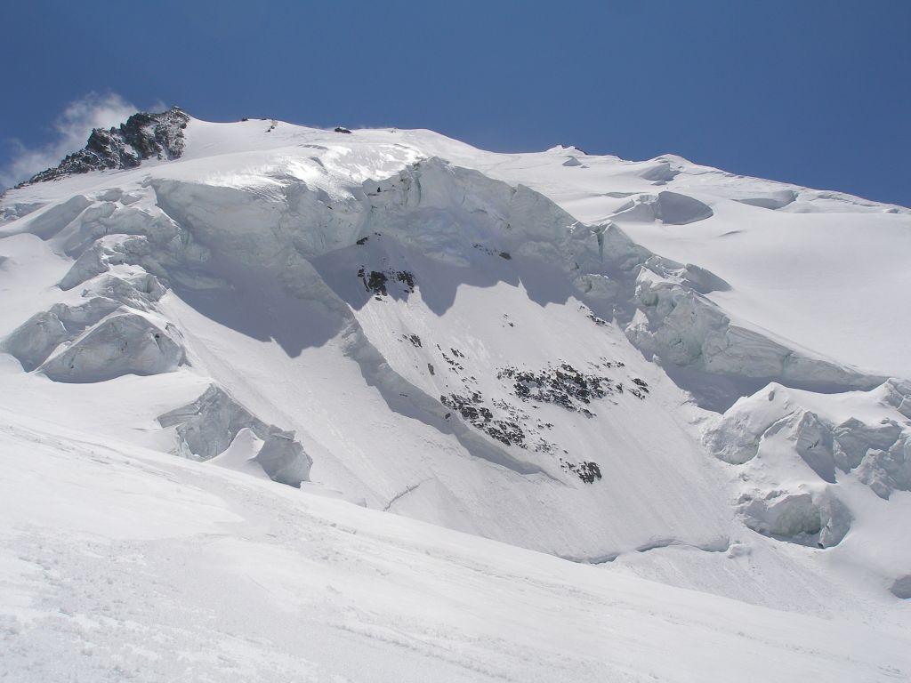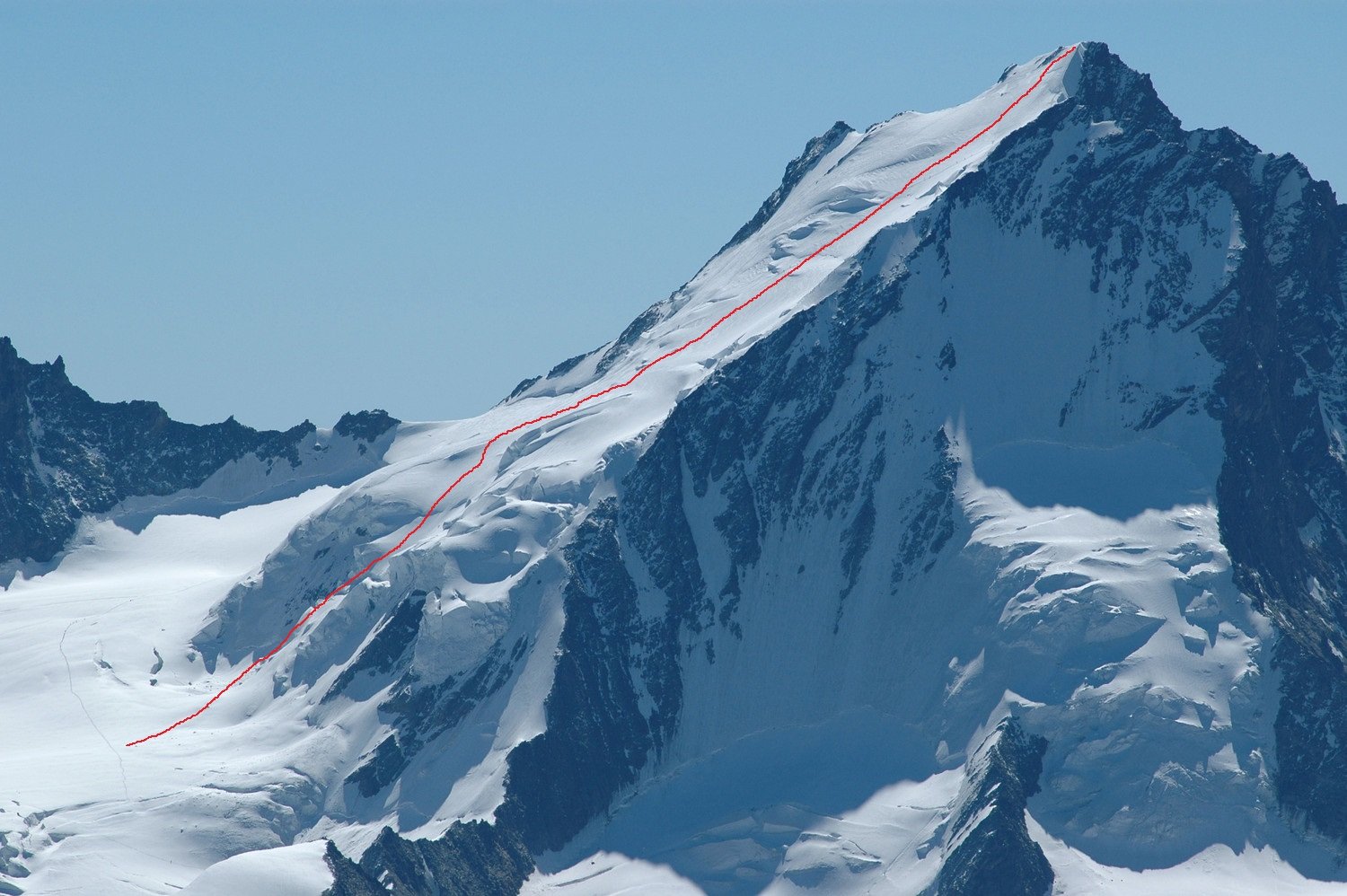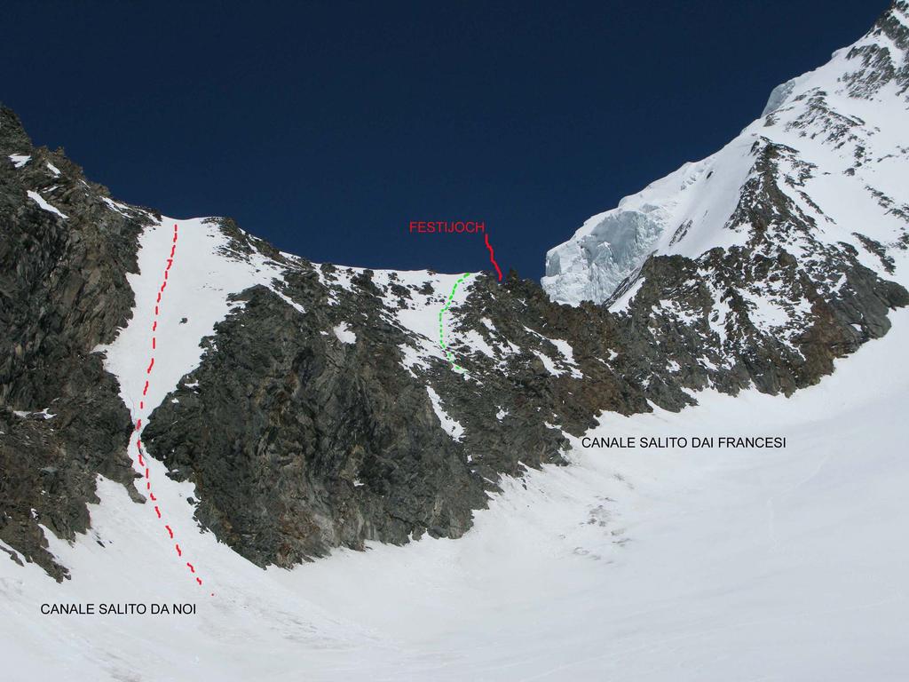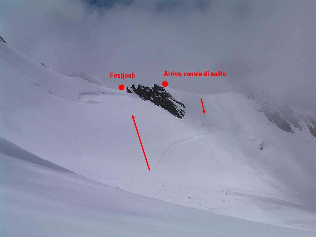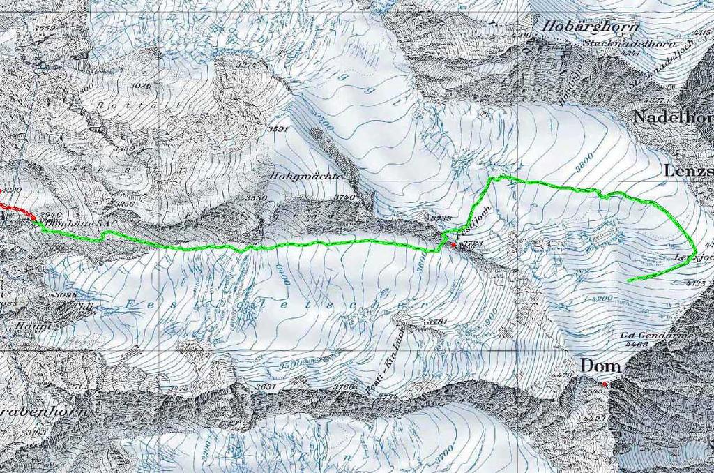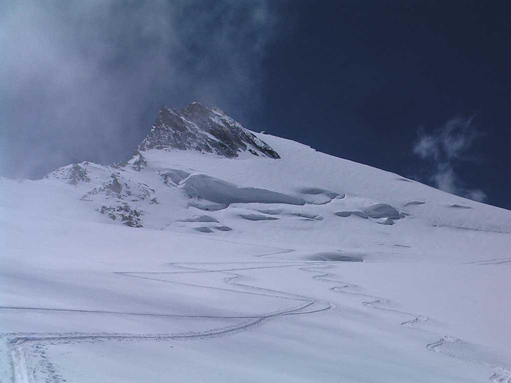 2^giorno: risalire la morena dietro il rifugio in direzione est (sentiero e ometti) e, appena possibile, spostarsi sul ghiacciaio che si percorre sulla destra orografica, fin sotto il Festijoch (3.723 m). Tolti gli sci, con l’ ausilio di alcune corde fisse, raggiungere il colle e scendere dal versante opposto (eventuale corda doppia su spuntone per superare la crepaccia terminale). In lieve discesa, attraversare l’ Hohberggletscher in direzione nord-est, passando sotto le imponenti seraccate che incombono sull’ itinerario. Risalirlo in direzione est, fin verso i 4.100 metri, poco sotto il Lenzjoch. Deviare, quindi, verso sud e salire il versante settentrionale della montagna su ripidi pendii, che, con pendenze sostenute, conducono alla croce della vetta (pendenza massima 40°).