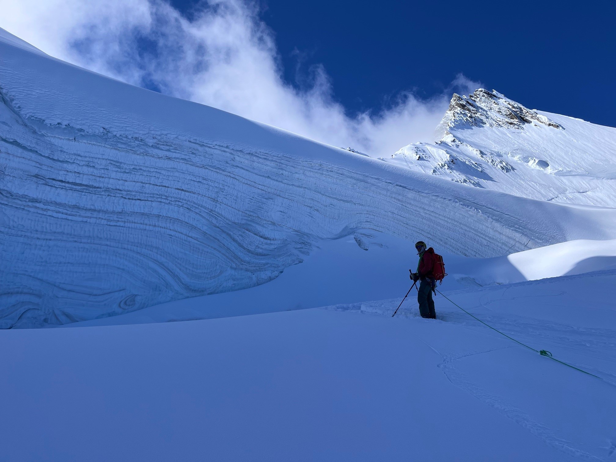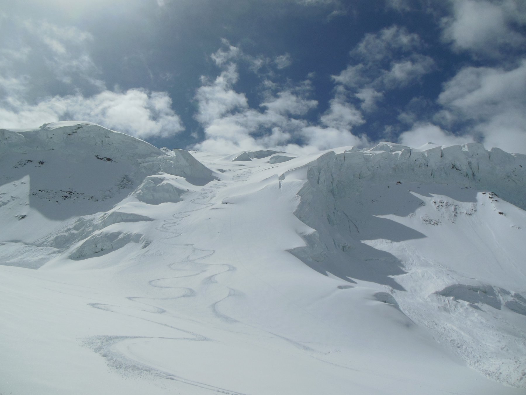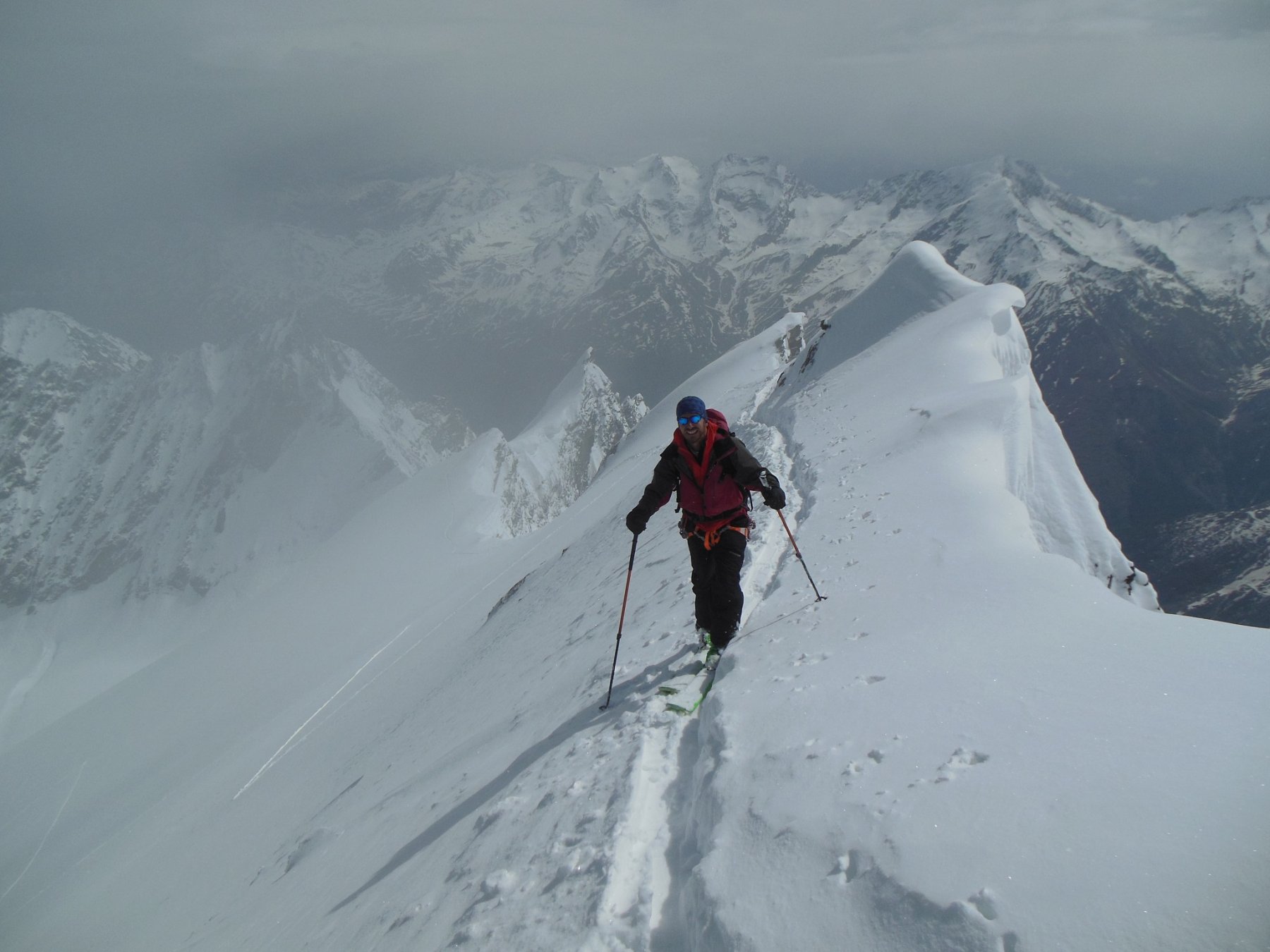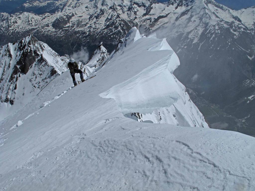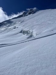 2^giorno: risalire la morena dietro il rifugio in direzione est (sentiero e ometti) e, appena possibile, spostarsi sul ghiacciaio che si percorre sulla destra orografica, fin sotto il Festijoch (3.723 m). Tolti gli sci, con l’ ausilio di alcune corde fisse, raggiungere il colle e scendere dal versante opposto (eventuale corda doppia su spuntone per superare la crepaccia terminale). In lieve discesa, attraversare l’ Hohberggletscher in direzione nord-est, passando sotto le imponenti seraccate che incombono sull’ itinerario. Risalirlo in direzione est, fin verso i 4.100 metri, poco sotto il Lenzjoch. Deviare, quindi, verso sud e salire il versante settentrionale della montagna su ripidi pendii, che, con pendenze sostenute, conducono alla croce della vetta (pendenza massima 40°).