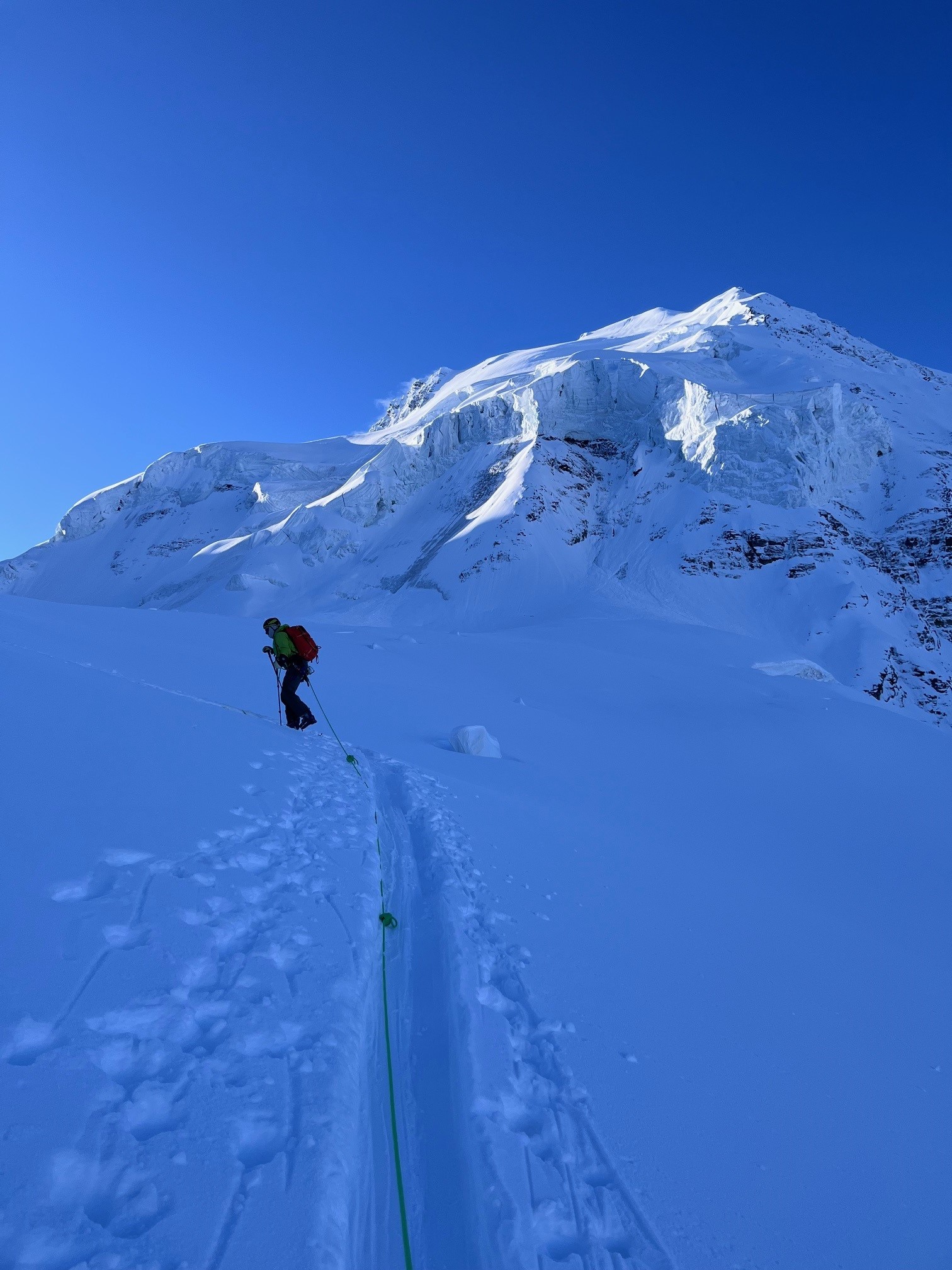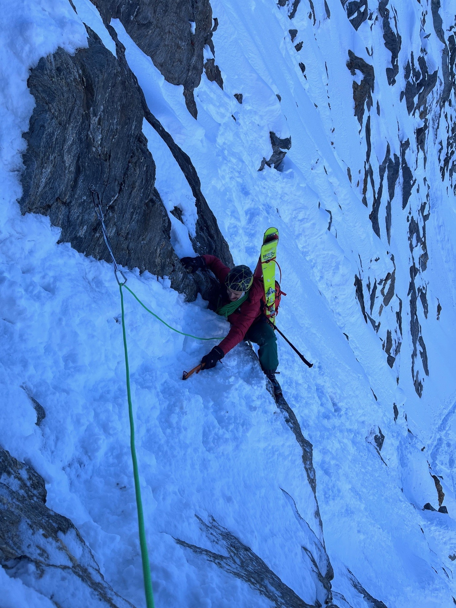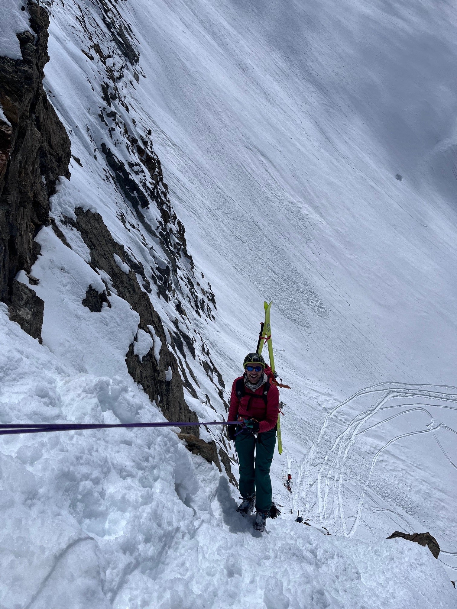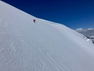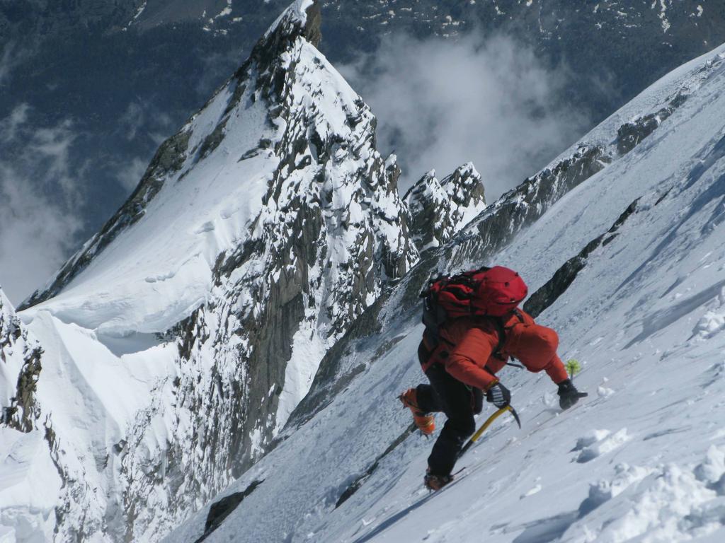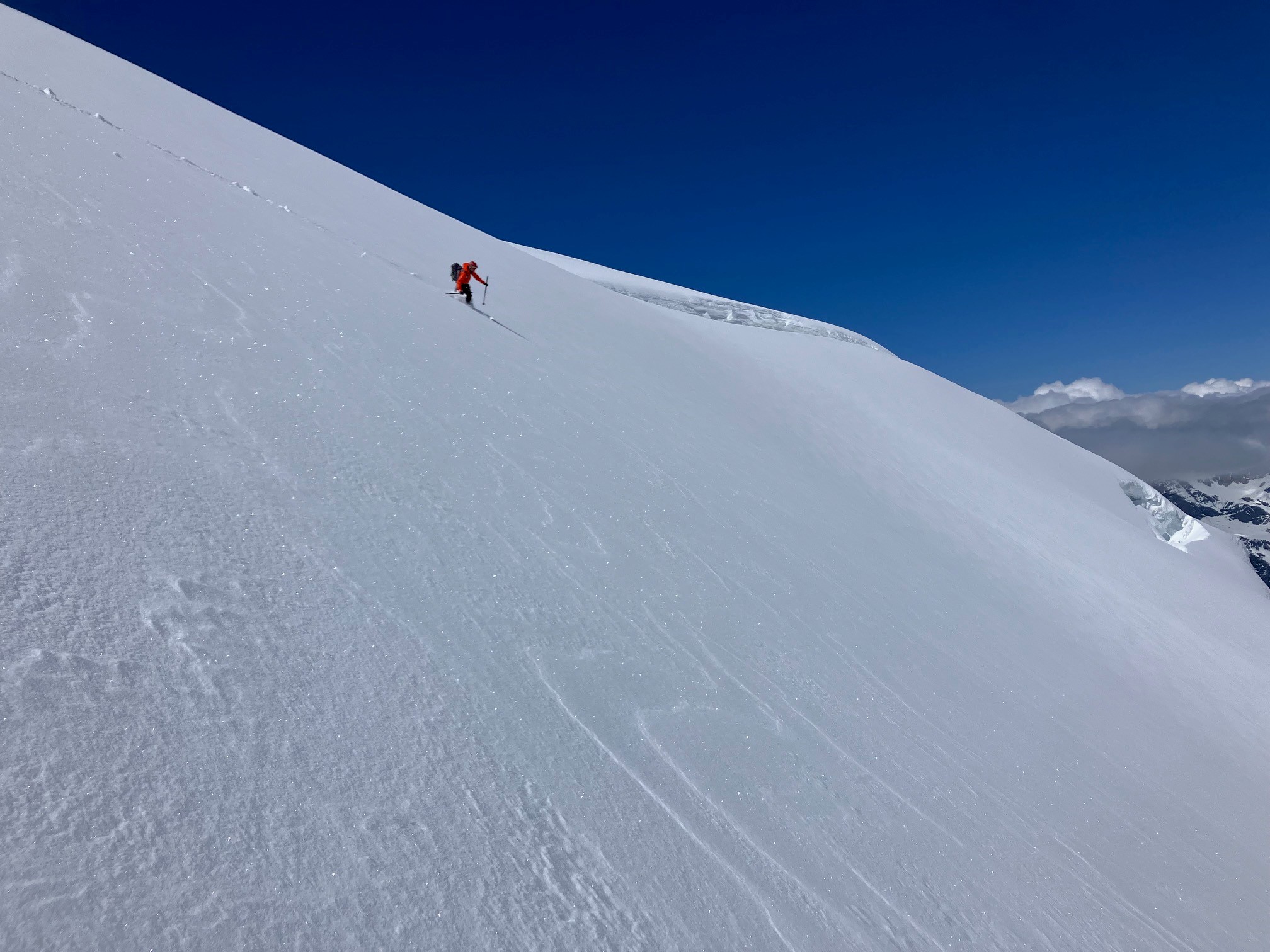 2^giorno: risalire la morena dietro il rifugio in direzione est (sentiero e ometti) e, appena possibile, spostarsi sul ghiacciaio che si percorre sulla destra orografica, fin sotto il Festijoch (3.723 m). Tolti gli sci, con l’ ausilio di alcune corde fisse, raggiungere il colle e scendere dal versante opposto (eventuale corda doppia su spuntone per superare la crepaccia terminale). In lieve discesa, attraversare l’ Hohberggletscher in direzione nord-est, passando sotto le imponenti seraccate che incombono sull’ itinerario. Risalirlo in direzione est, fin verso i 4.100 metri, poco sotto il Lenzjoch. Deviare, quindi, verso sud e salire il versante settentrionale della montagna su ripidi pendii, che, con pendenze sostenute, conducono alla croce della vetta (pendenza massima 40°).