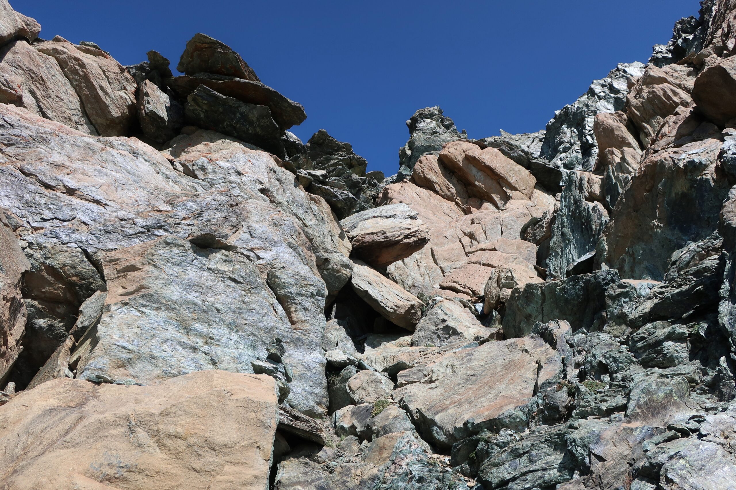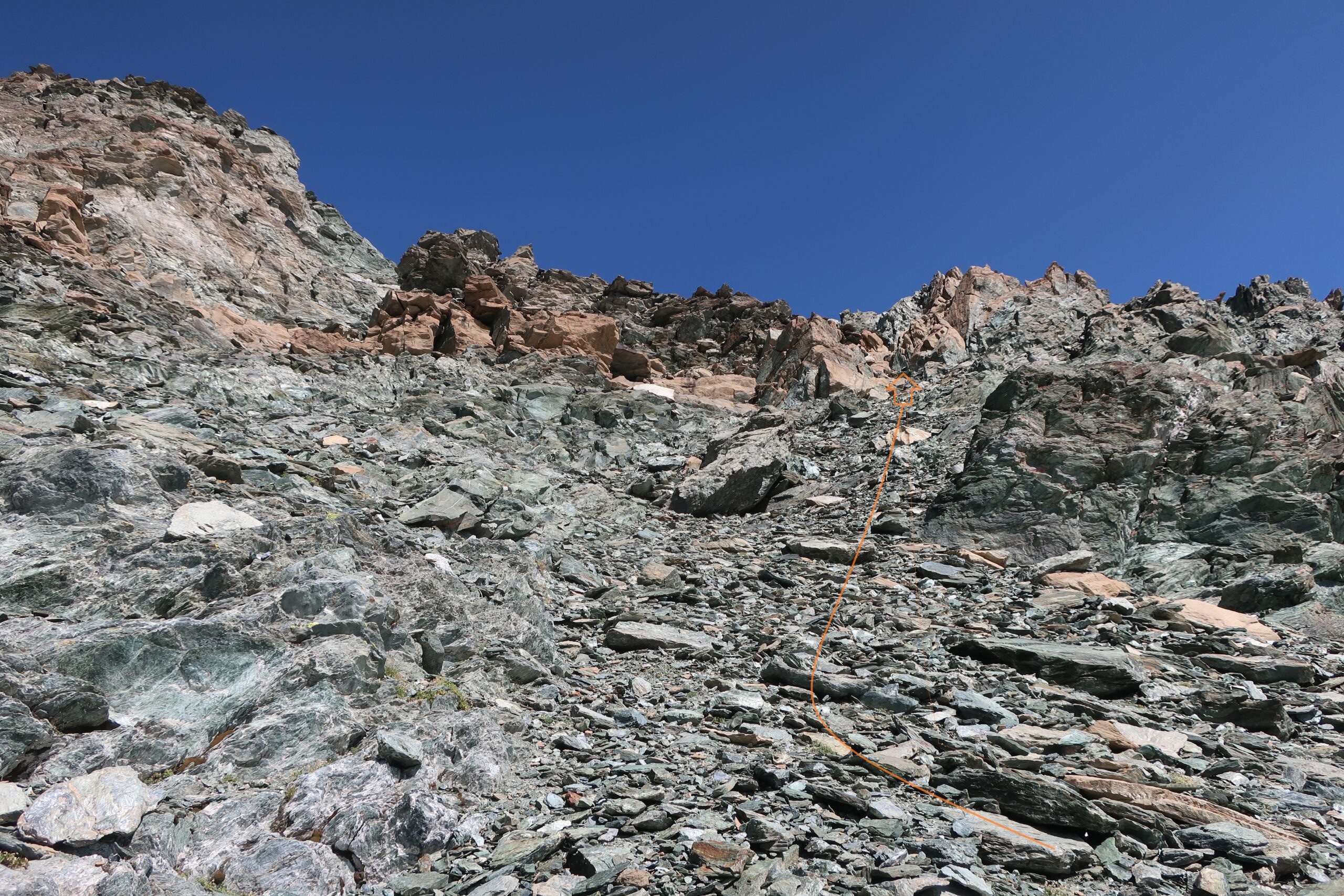 Entrambe le possibilità si riuniscono all’altezza della grangia del Rancio di Sotto 2080 m. Si sale in breve alla gr. Giardino del Rancio 2152 e si divalla in direzione nord-nord ovest alla volta di un pianoro 20 m più in basso e sormontato da due evidenti canali. Si imbocca quello di dx 2230 m e lo si segue stando all’inizio tendenzialmente a dx del corso d’acqua. Dopo una strettoia con placche rosse levigate il canale si allarga aprendosi a tre vie: una forra incassata a dx e ostruita da un macigno, una cascata centralmente, un breve ed ombroso canaletto posto a sx della cascata. Si punta a quest’ultimo guadagnando prima la dorsale erbosa che lo precede, si giunge al suo fondo dove un passo di II sulla dx (roccia ed erba) permette di accedere ai pendii superiori. La pendenza ora gradualmente scema ed il fondo da erboso salendo diventa pietroso. Ci si tiene sul dosso centrale e si sale sino a sotto al Colle Miserino assolutamente difficile da individuare. Si punta ad una fascia arancione spessa circa 3 m che solca a dx (dir nord) il pendio/parete posta più o meno dietro ed a sx di un affioramento granitifero rosato. Un ometto segna un buon passaggio possibile tra le rocce (II grado) ed un ultimo ometto è posto pochi metri sotto al colle. Ci si ribalta quindi su di esso 2842 m.