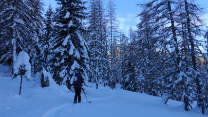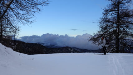 Tempo sereno e -4 alla partenza , dalle 13 peggiora ma neve ben sciabile . Manto nevoso ben assestato anche a Nord con fondo compatto e neve morbida in superficie , sulla dorsale ho sentito due lievi assestamenti