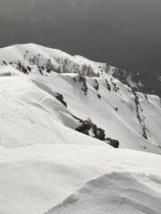 poi neve continua fino in cima, molta neve portante e mediamente ben assestata, discesa bella fino alla strada su neve primaverile ventata da scaire con leggerezza….ma mai sfondosa, poi giu nel bosco delle Navette a recuperare la poderale che torna a Salse li inizia a mancare la neve sulla strada, bella giornata anche senza sole pieno, ” gita da amatori…..”