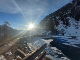 La parte alta si svolge su pista attualmente chiusa ma innevata e battuta, neve compatta.