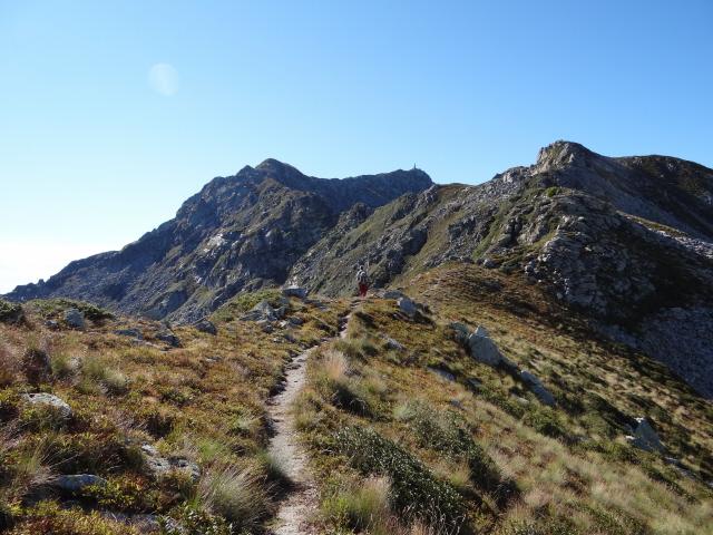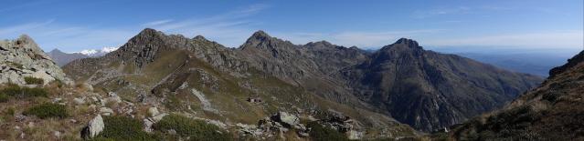 Dal colle a dx percorrendo tutta la bella dorsale, in alcuni punti un po’ esposta (mai difficile) incontrando un tratto di corda che aiuta a superare un breve balzo di roccette per proseguire di cresta sino a raggiungere Punta Tre Vescovi 2344m e di li alla ormai vicina Colma di Mombarome 2371m.