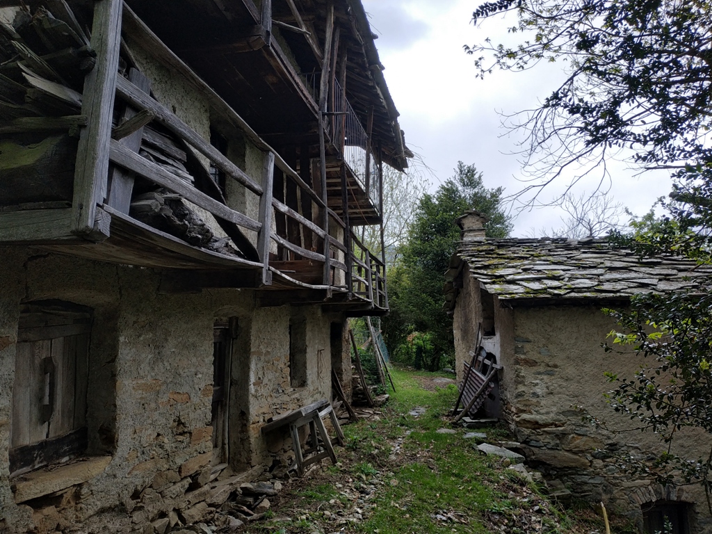 Questa volta ho percorso anello alternativo ed allargato per visitare le borgate adiacenti che più mi interessavano. Partito da Villanova: San Rocco, Crotto, Ciuccia, Mombianco, Cavagnole e ritorno. Tratti di sentiero devastati un po’ dai cinghiali e un po’ dalle intemperie con qualche cedimento. Alcuni alberi caduti rallentano la progressione obbligando laboriosi aggiramenti o acrobazie. Borgata Ciuccia in totale abbandono ma con atmosfera magica. A Mombianco, grazie a sterrata faraonica, colossale ponte sospeso da una milionata di euro e alla teleferica ormai inutile dopo la possibilità di arrivare in auto, resistono alcune famiglie durante i fine settimana, ma… quanto mi costi!