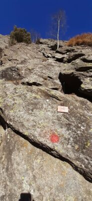 - L1 – Partenza su bella fessura con nut incastrato dal quale pende il cavetto che sostiene la targhetta con nome. Segue pilastrino verso sx con ottimi appoggi fino in sosta, comoda accanto a cuspide acuminata, 20 m 5b.