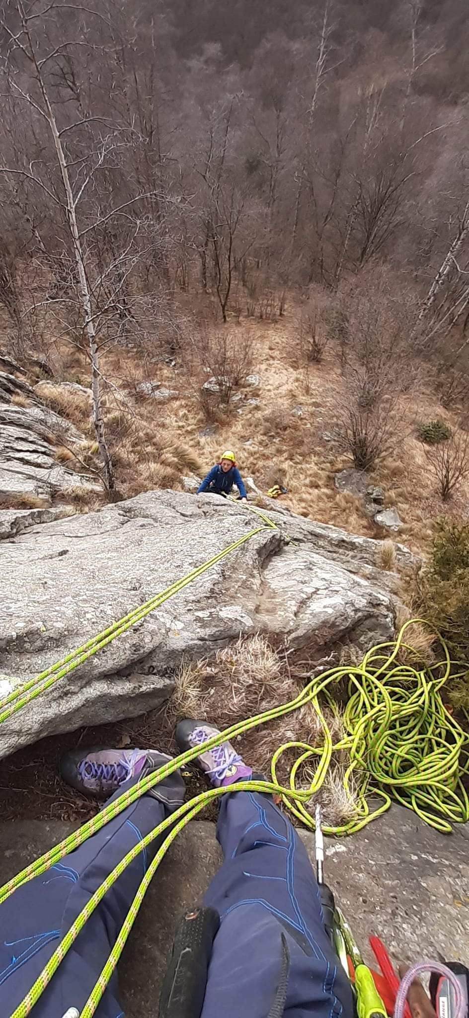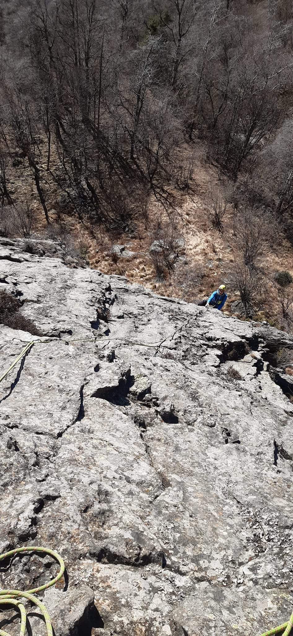 - L3 – Partenza su liscia placchetta poi a sx per scavalcare un canaletto erboso e stabilizzarsi sulla placca oltre questo. Ora seguendo l’andamento di bellissimi appigli ed appoggi un po verso sx fino in sosta su piccolo gradino, 28 m 5b.
