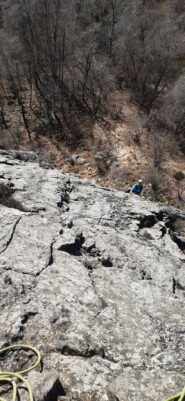 - L2 – Salire sul vertice del lastrone per poi spostarsi a dx su bellissimo pilastro con eleganti movimenti, uscire del piccolo bombamento su ergonomici bitorzoli sporgenti. Prima della sosta ancora un lieve strapiombino ben manigliato, 27 m 5c.