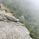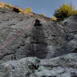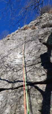 - L3 – Parete molto lavorata con bitorzoli ergonomici e lame, oltre ad i fix sono presenti anche un chiodo ed un nut ben incastrato, sosta su terrazzino, 30mt. 5a.