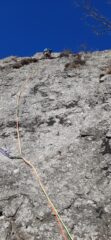 - L2 – Bella placca verticale con buoni appigli poi a sx oltre un canaletto erboso su altra placca con lame fino in sosta su comodo gradino, 30 mt. 5b.