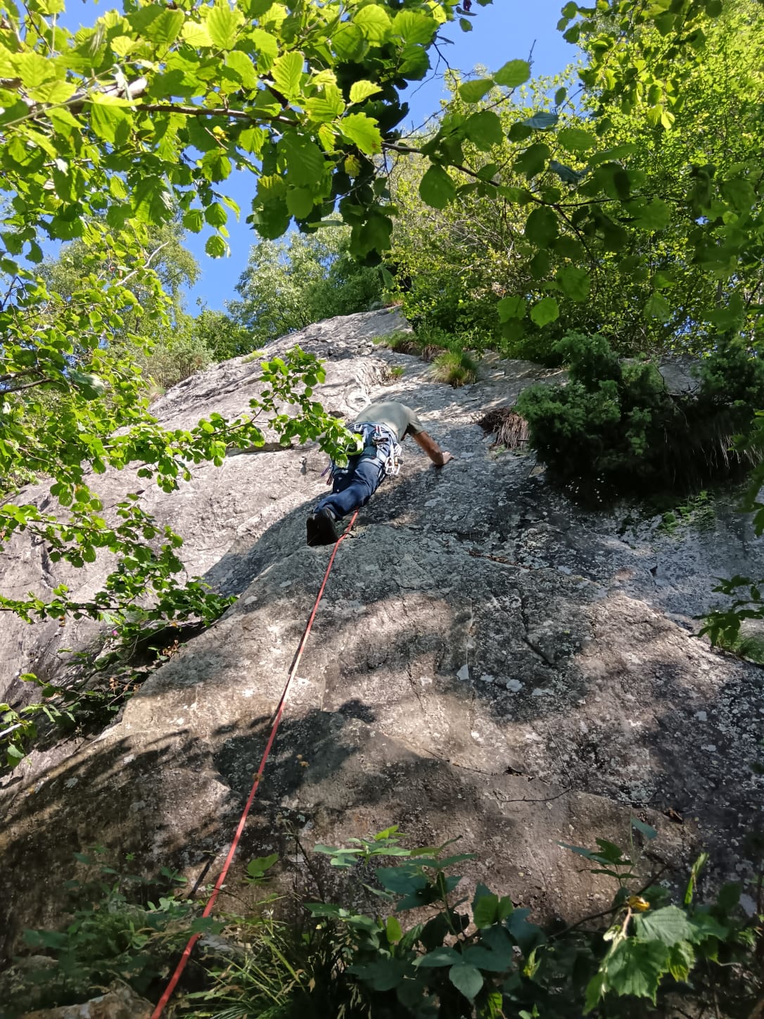 - L1 – Placca liscia con fix poco sopra attacco, 6a passo chiave fino ad afferrare la lama con chiodo sopra. A sx più facile 5c. Segue breve gradino verticale ben manigliato con fix altezza viso e poi pilastrino di roccia scura fino in sosta su terrazza e betulla, 30mt.