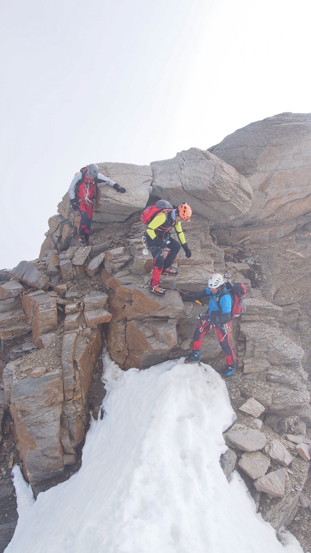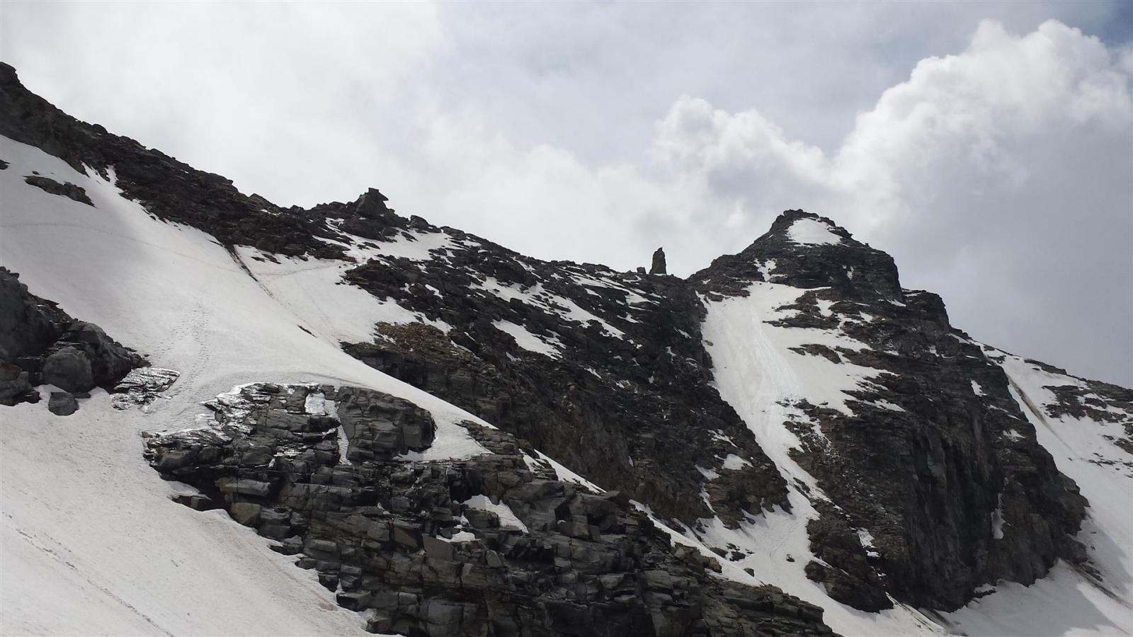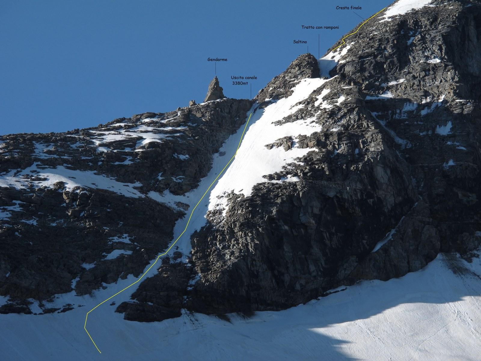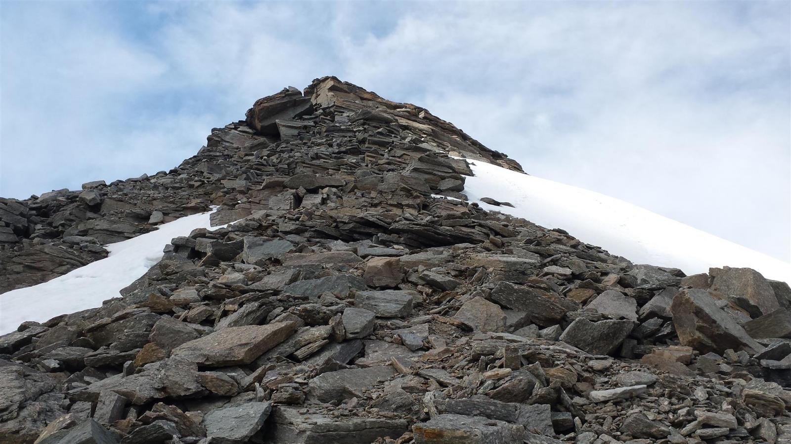 Arrivati all’uscita in prossimità del gendarme(quota 3380mt)si raggiunge in cresta un saltino di circa 5/6mt che si supera disarrampicando e si percorre l’ultimo tratto di cresta su terreno non troppo bello,terra e sfasciumi poco stabili,fino in cima.