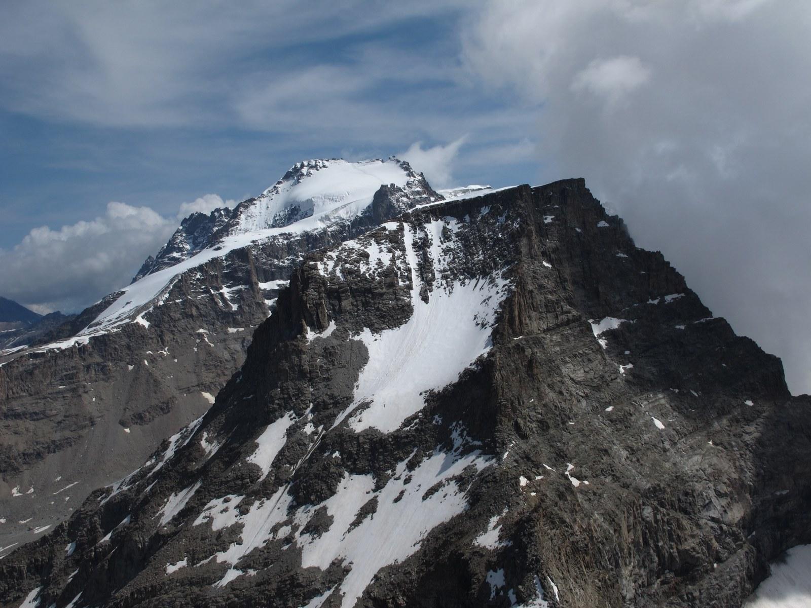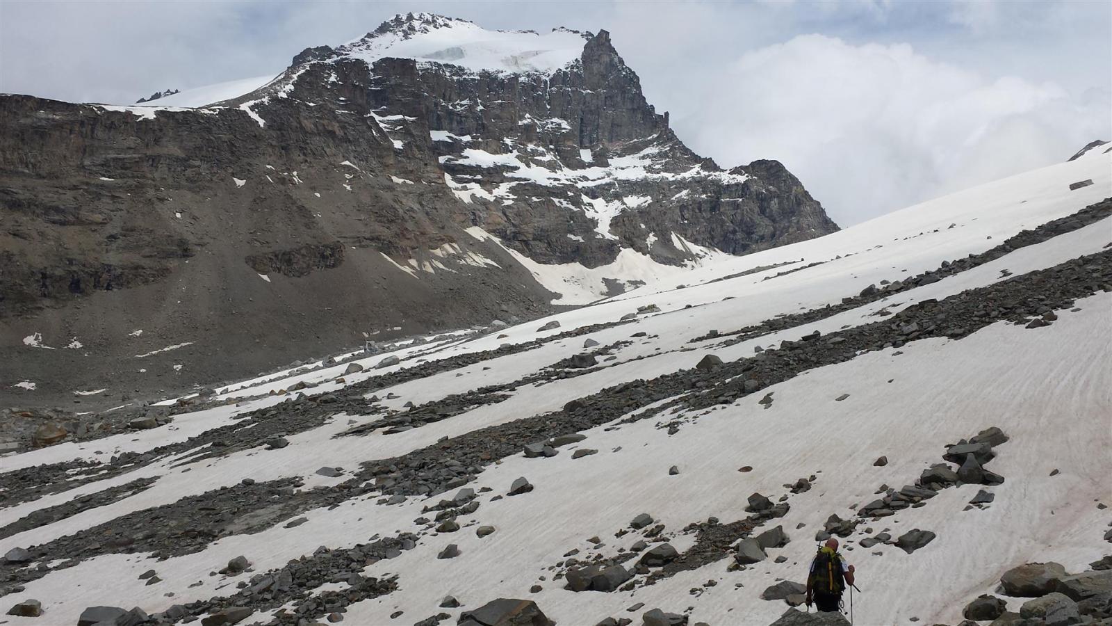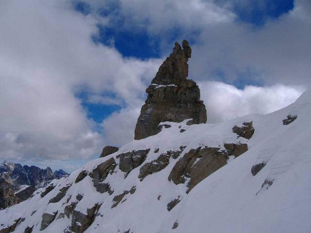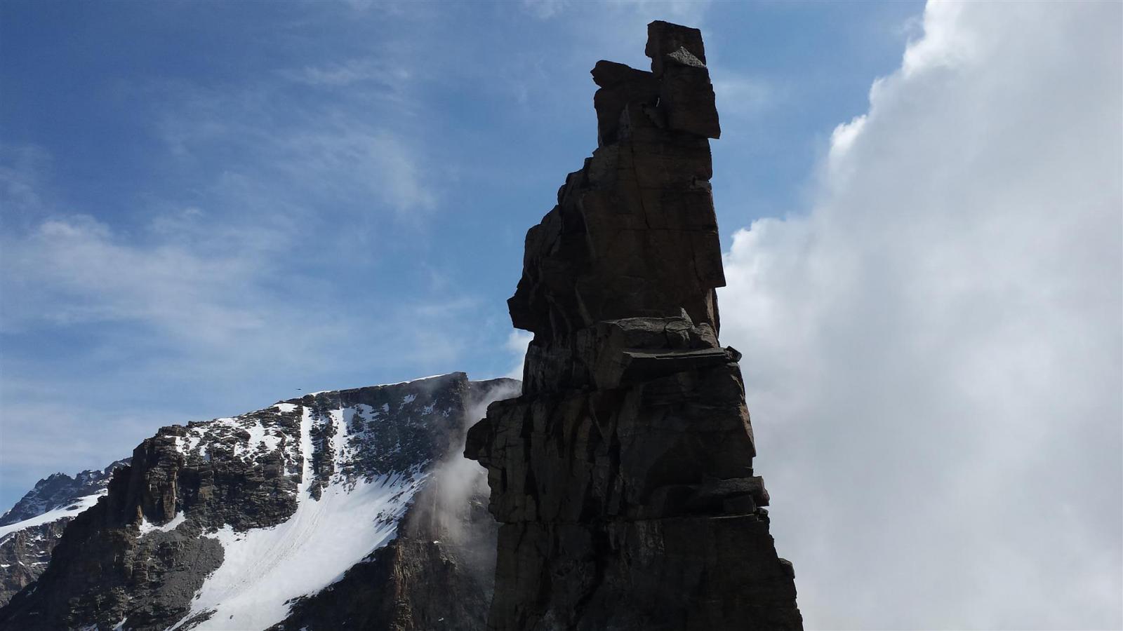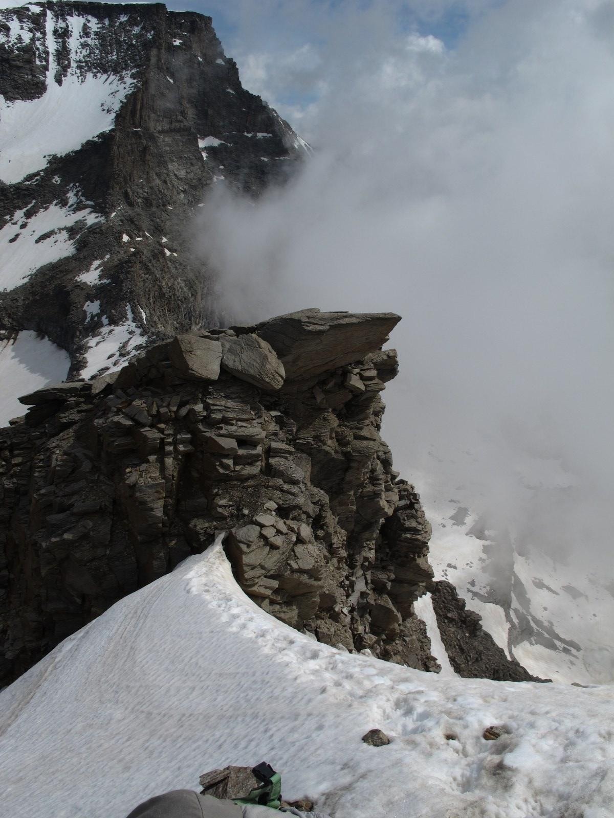 Arrivati all’uscita in prossimità del gendarme(quota 3380mt)si raggiunge in cresta un saltino di circa 5/6mt che si supera disarrampicando e si percorre l’ultimo tratto di cresta su terreno non troppo bello,terra e sfasciumi poco stabili,fino in cima.