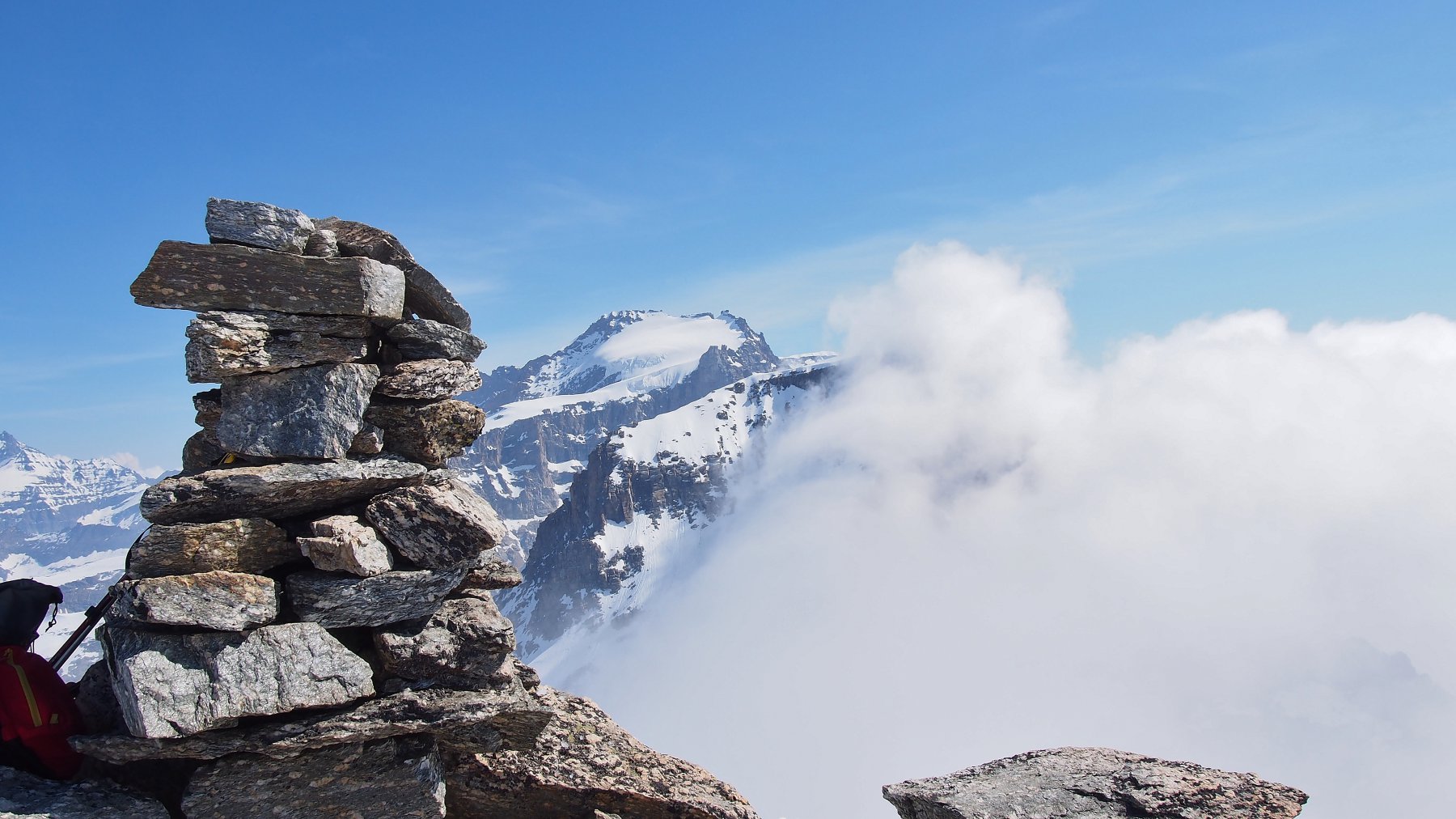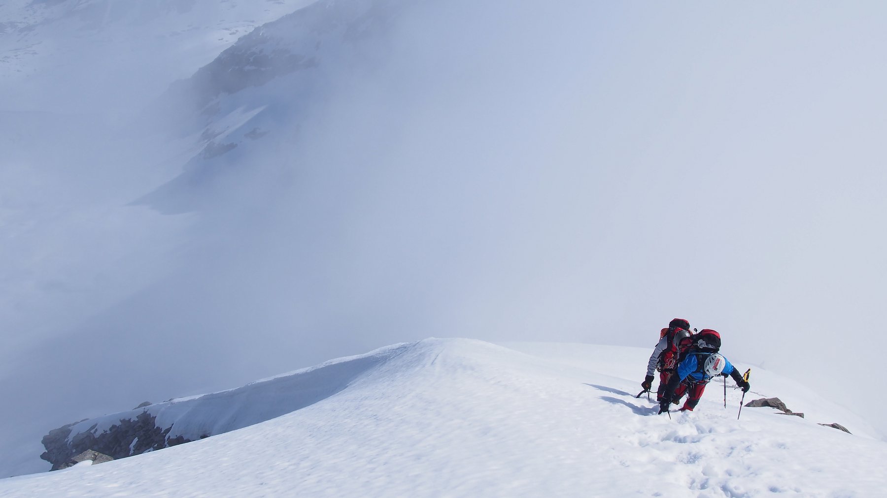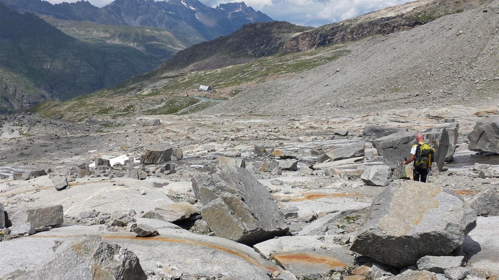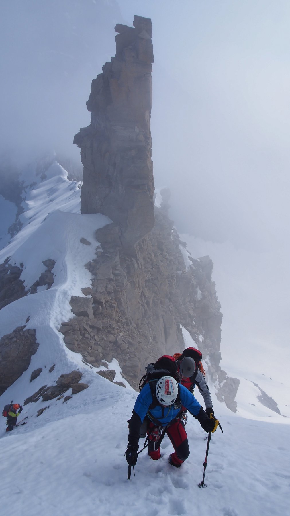 Arrivati all’uscita in prossimità del gendarme(quota 3380mt)si raggiunge in cresta un saltino di circa 5/6mt che si supera disarrampicando e si percorre l’ultimo tratto di cresta su terreno non troppo bello,terra e sfasciumi poco stabili,fino in cima.