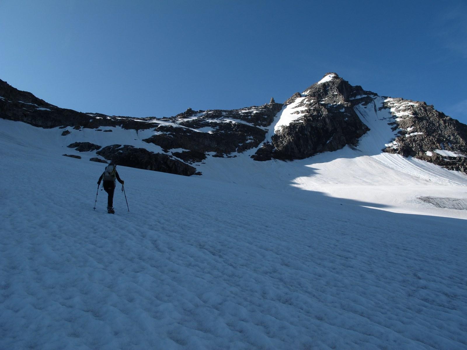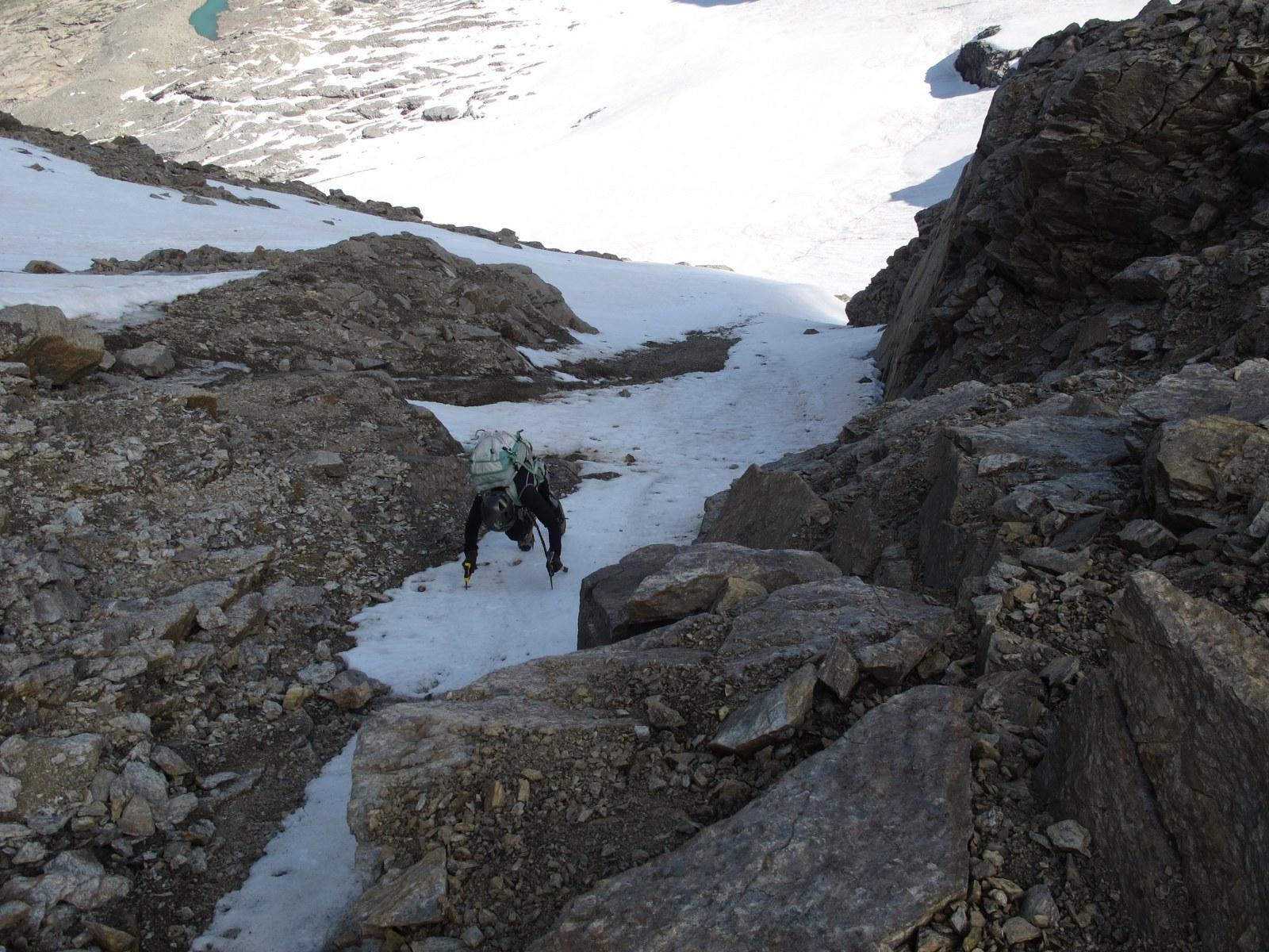 Passati oltre l’ “attacco” della normale, sotto le rocce si sale la rampa ascendente verso destra,strettoia a stagione avanzata, fino ad una spalla che immette nel canale.