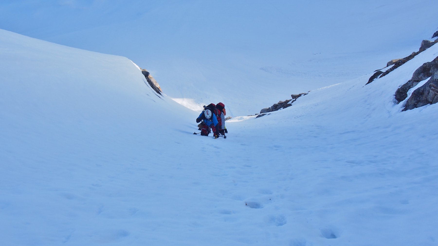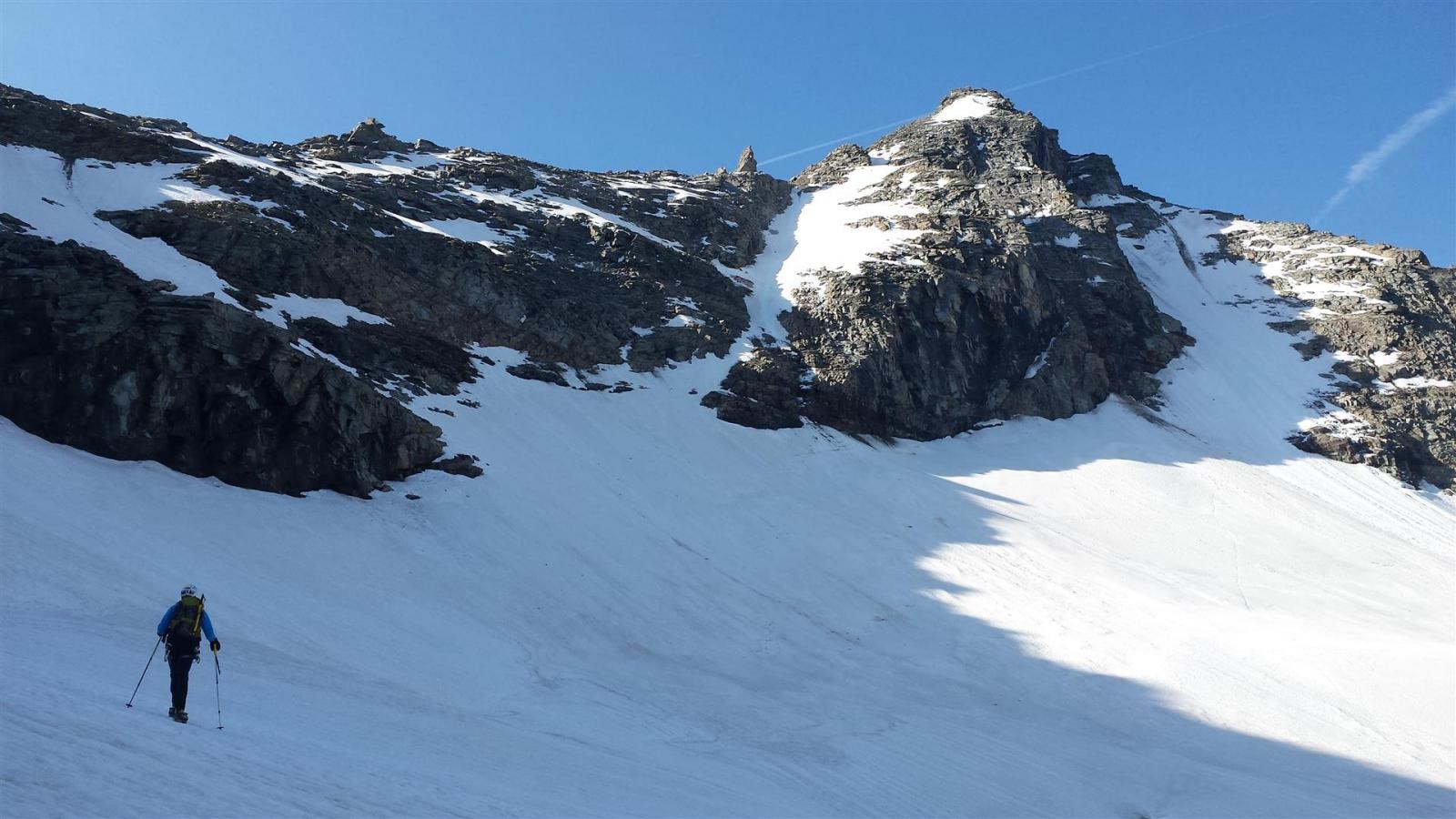 Da qui scegliere il percorso migliore: con neve dura è buono sul lato sinistro (in ombra),le pendenze sono costanti tra i 40° e i 45° per un dislivello di circa 300mt.