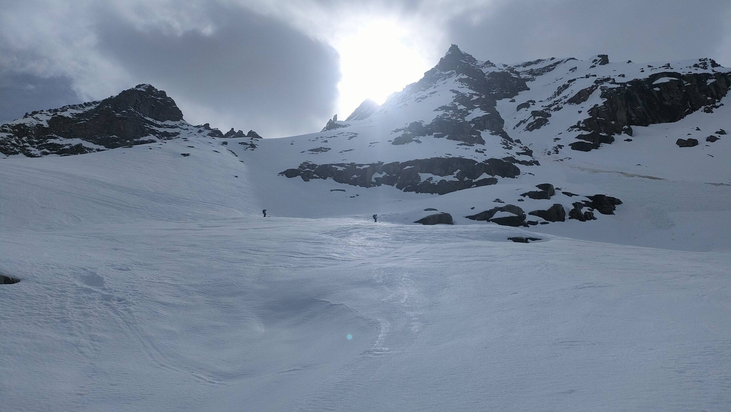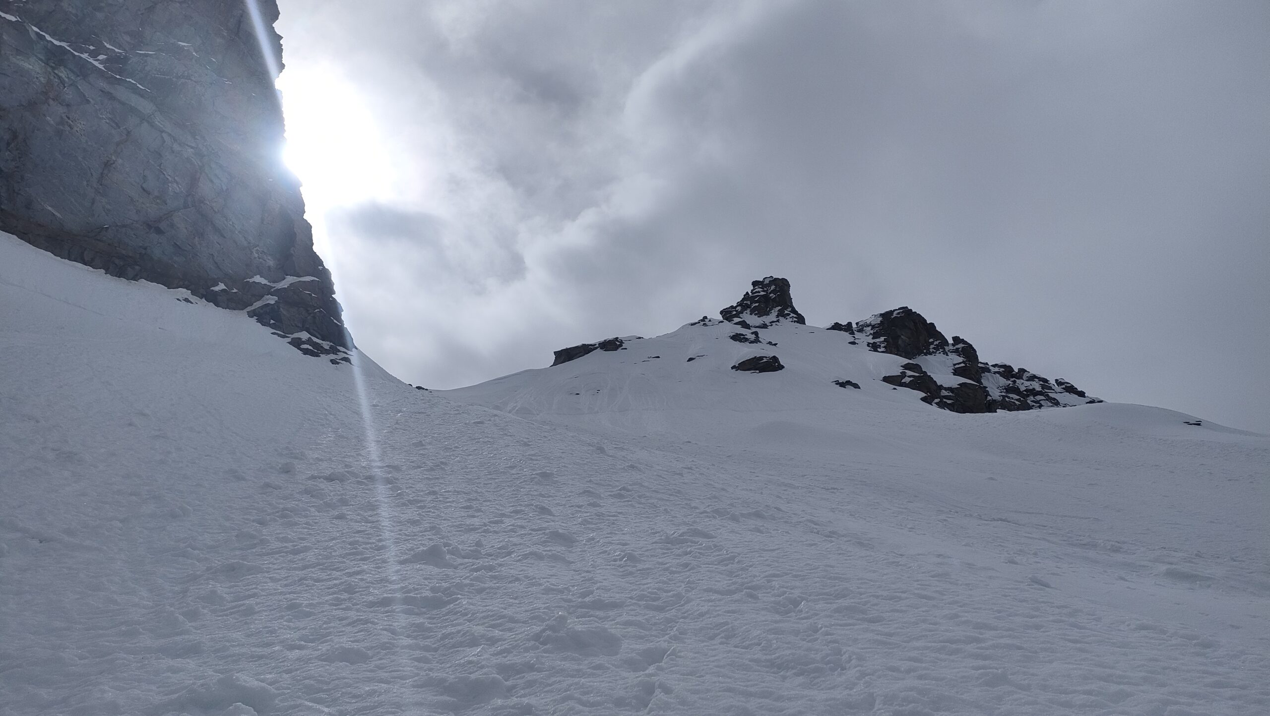 Risalire il largo canale che scende dal Colle di Monciair, netta depressione posta tra l’omonima Becca e i Denti del broglio (38° di media su 400 m). Si sale in sci fin dove possibile e poi a piedi, fino al colle.