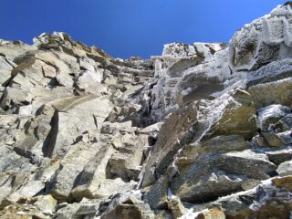 La parte alta della via, dopo “la zona abbattuta di diedri grigi”, la via si presenta incrostata di neve e ghiaccio incollati dal vento. Arrivato all’ “ampia depressione” ho stabilito non fosse piú divertente passare di li. Ho quindi disarrampicato il tiro e traversato a dx sotto le “placche rosse”, per andare a immettermi nel gran canale a destra della cresta. Da lí con tre lunghi tiri abbiamo a malincuore aggirato la parte centrale della via fin sotto il castello sommitale.