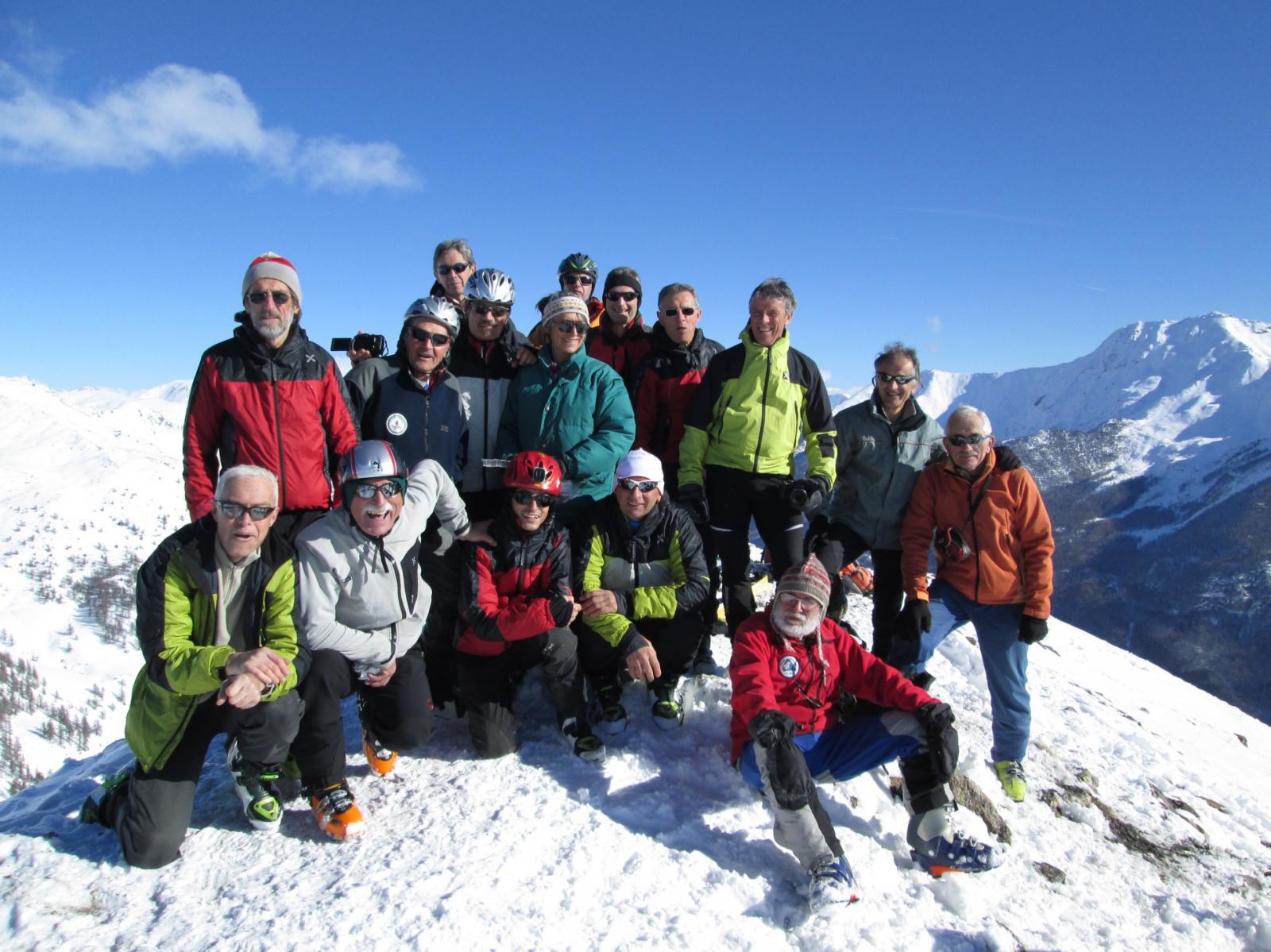 le quattro stelle ci stanno tutte, a volte ci starebbe anche qualcosa di più. Meteo ottimale e panorama stupendo dalla vetta. Nel 2009 ero salito da Allevè, oggi siamo saliti da Granges di Pragelato; siamo scesi più a sinistra, nel bosco pensando che la neve fosse migliore anche se Lory sceso con la tavola da dove siamo saliti, ha detto di aver trovato neve ottima. Oggi in 15 “evergreen” abbiamo arato in discesa tutta la neve vergine che abbiamo trovato