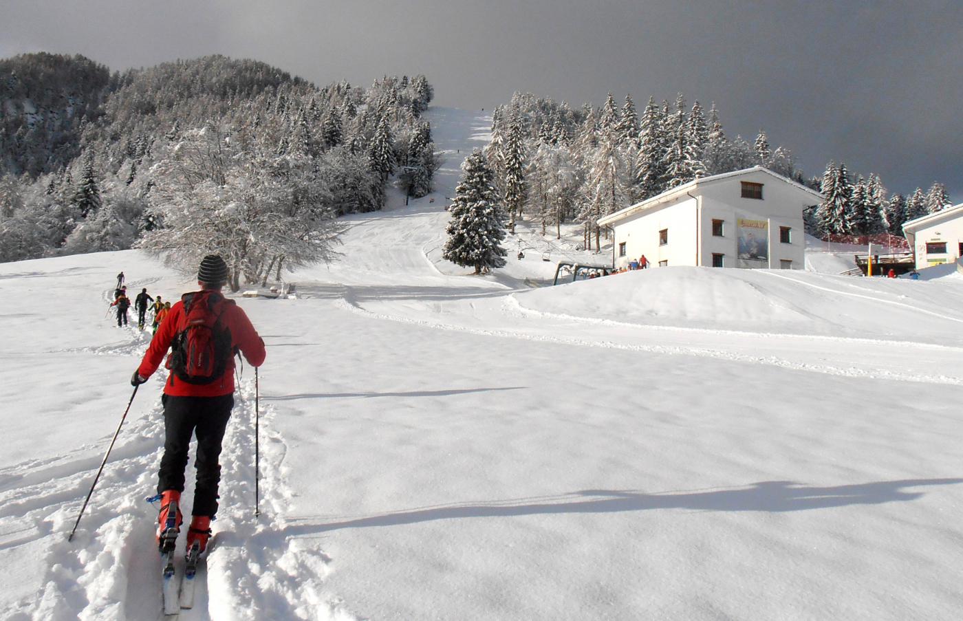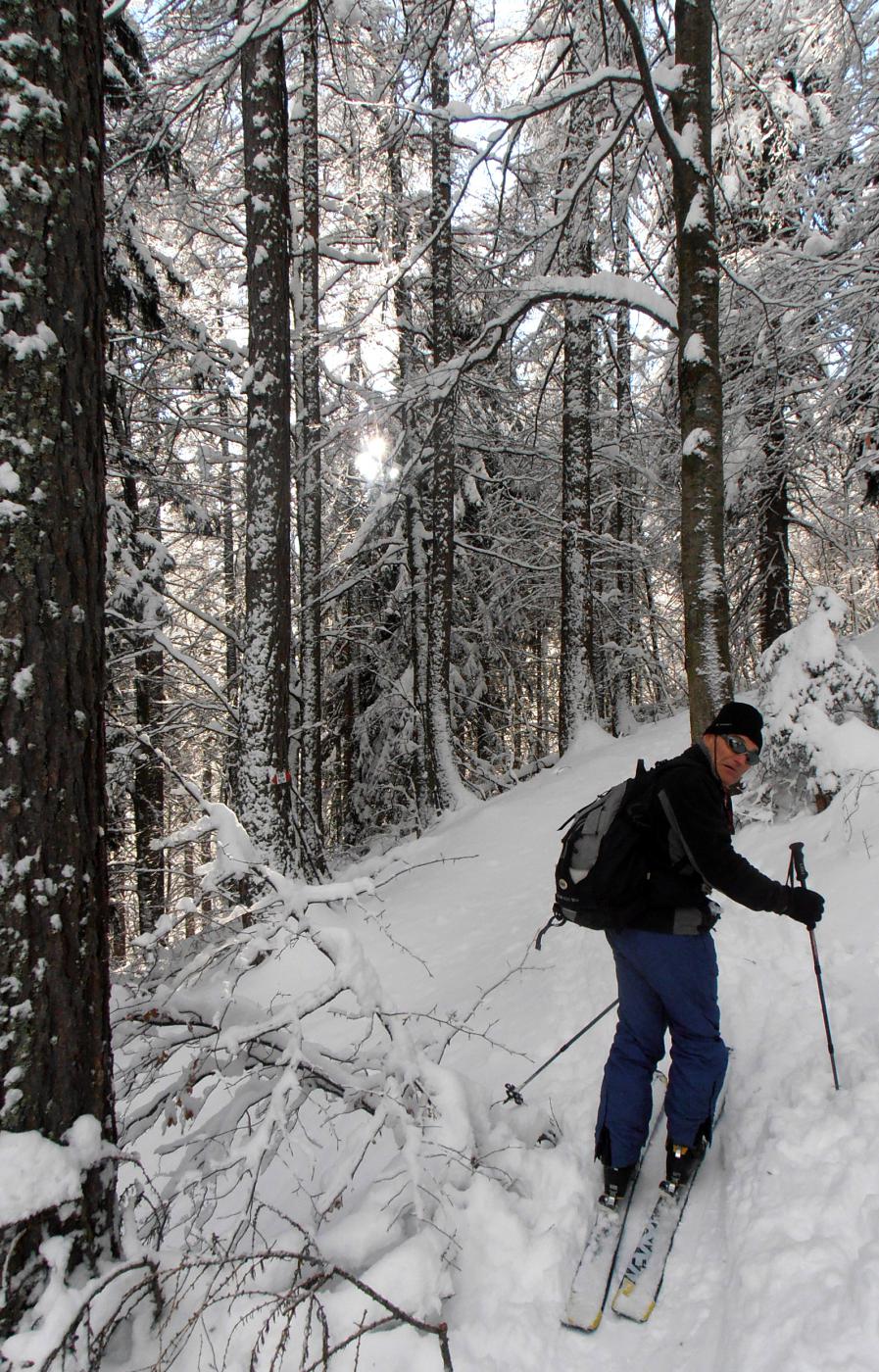 In discesa: neve pesante,non si toccano pietre nel canalone e nel bosco,tratto finale in pista.
